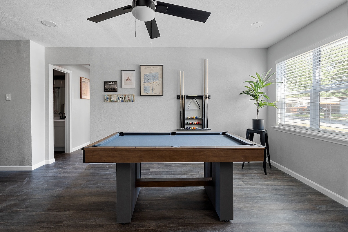 I-Arlington man-cave ihlangana nokunethezeka kwe-6min ukuhamba epaki ukuya enkundleni ye-AT&T, i-Globe Life Park noma inkundla ye-Choctaw! Akuyona nje indawo yokuhlala, kodwa ukudlala! Rack umdlalo we-pool noma uphonse imicibisholo ngenkathi usakaza izinhlelo zokusebenza ozithandayo ku-65" 4k HDTV yethu. Phumula ngesitayela ngezinto zombhede zokunethezeka namathawula, ikamelo ngalinye eline-TV, noma ujabulele igceke elingemuva langasese nemidlalo ehamba phambili. Ifulethi eliphansi phansi elinendawo yokupaka YAMAHHALA - akukho ukushayela noma itekisi ngosuku lomdlalo ibhonasi yangempela. I-5min drive eya kumafulegi ayisithupha & HH!