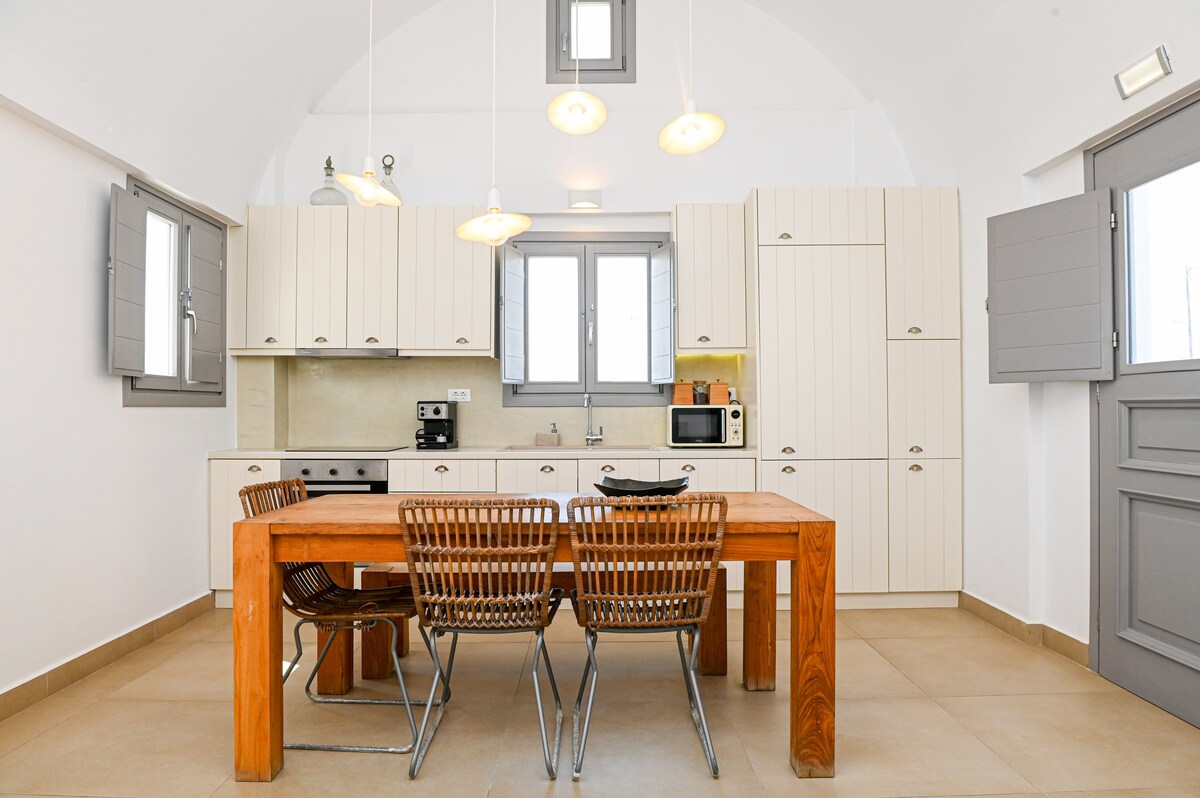 Kubhekwe eceleni kwamawa cishe amamitha angu-400 ngaphezu kolwandle. Ikia Kriton isiko Cave House nge Private Jacuzzi emzaneni wase-Imerovigli obusisiwe ngokubukwa okubabazekayo kwe-Caldera futhi kuhlelwe ukuze uthole isiqhingi sonke. Ilungiswe ngo-2021 kusuka endlini endala yedolobha, isakhiwo esihle esincane esamukelwa ngokugcwele izakhiwo zendawo kanye nezici zendabuko ngenkathi zihlanganisa ifenisha yendawo eyenziwe ngezandla ngokuhlotshiswa kwesimanje futhi inikeza isikhala esiningi sokuphumula ngaphakathi nangaphandle.