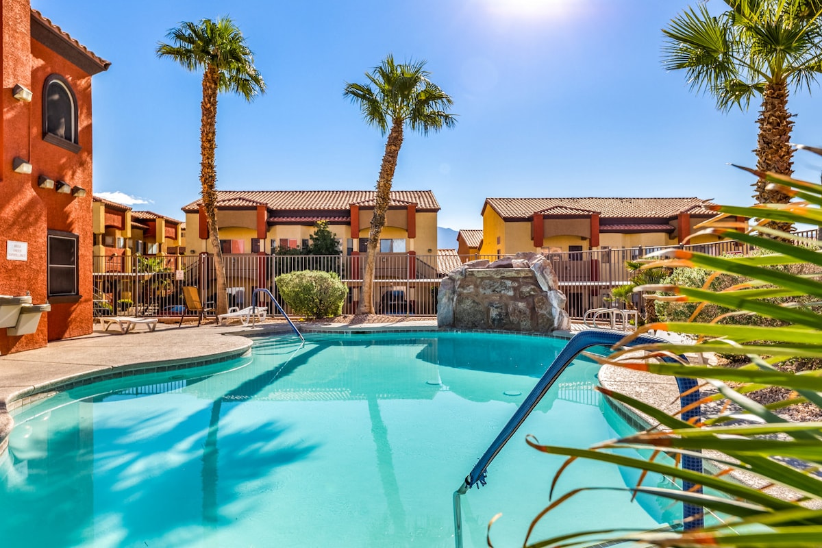 Le Mesquite Retreat yikhaya lakho elikude nasekhaya. Inamakamelo okulala angu-3 namagumbi okugezela angu-2, le condo enefenisha ephelele ilala kuze kufike ku-9. Ilungele abangane nemindeni ehamba ndawonye. I-condo iza nama-smart tv ekamelweni ngalinye nasendaweni yokuhlala, umshini wokuwasha/wokomisa usayizi ophelele, i-inthanethi enejubane eliphezulu, isethaphu yekhishi eligcwele, futhi iseduze nendawo yomphakathi enendawo yokuzivocavoca, indawo yokubhukuda, ubhavu wamanzi ashisayo nezindawo zokosa inyama. Kungakhathaliseki ukuthi uza ngegalofu, ukugembula, ukuzulazula, noma imidlalo, uzoba seduze nakho konke.