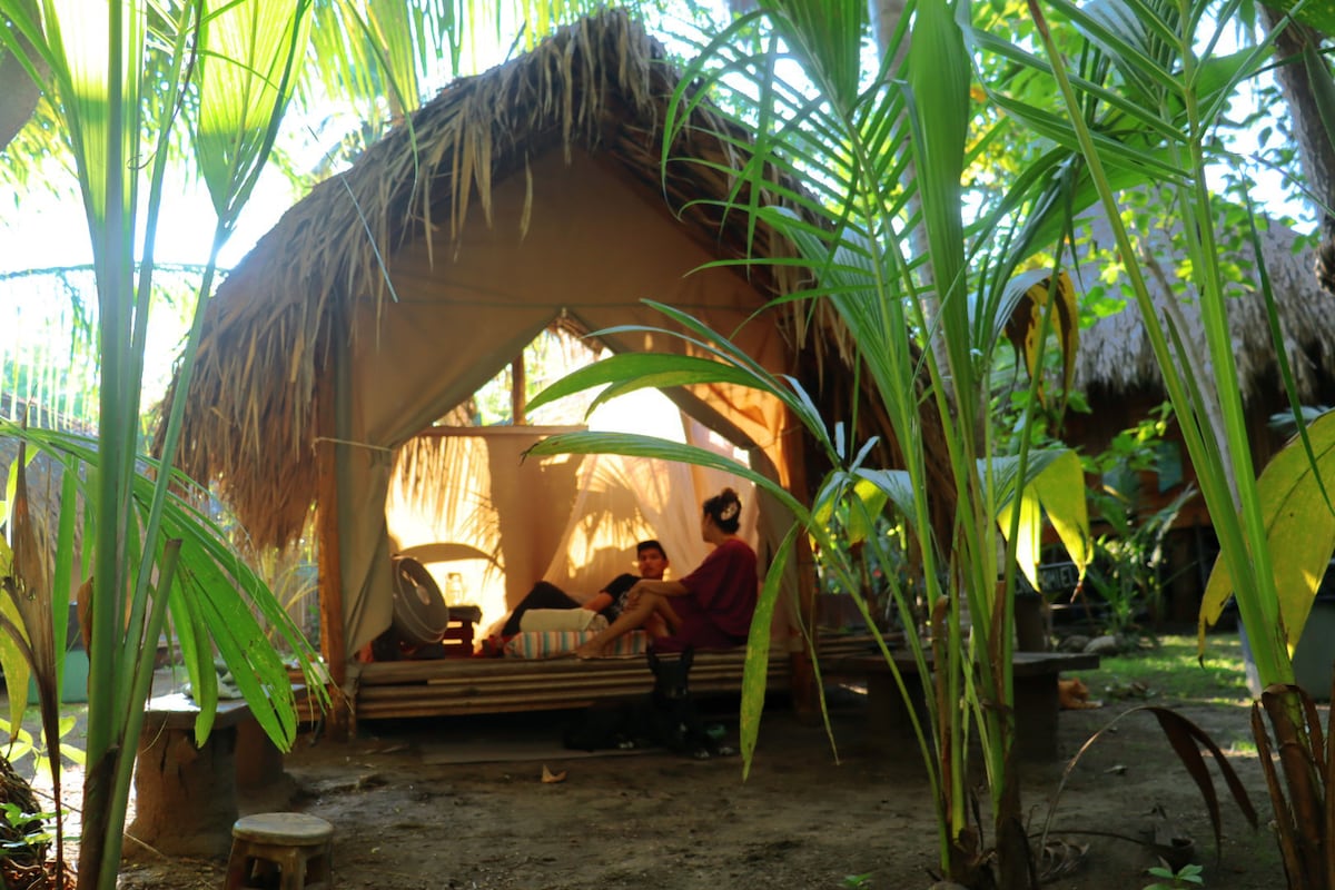It's a teepee made of fabric with a palapa roof, set on a wooden platform in a shady, wooded area near the lagoon. It offers beautiful views of the surrounding vegetation, with no light pollution or noise. It includes a double mattress, sheets, pillows, towels, a fan, and a hammock, as well as access to all the resort's facilities. Electricity is available, and there are shared eco-friendly restrooms nearby.