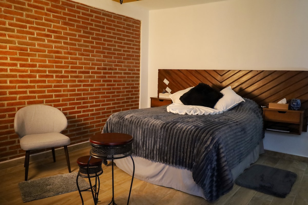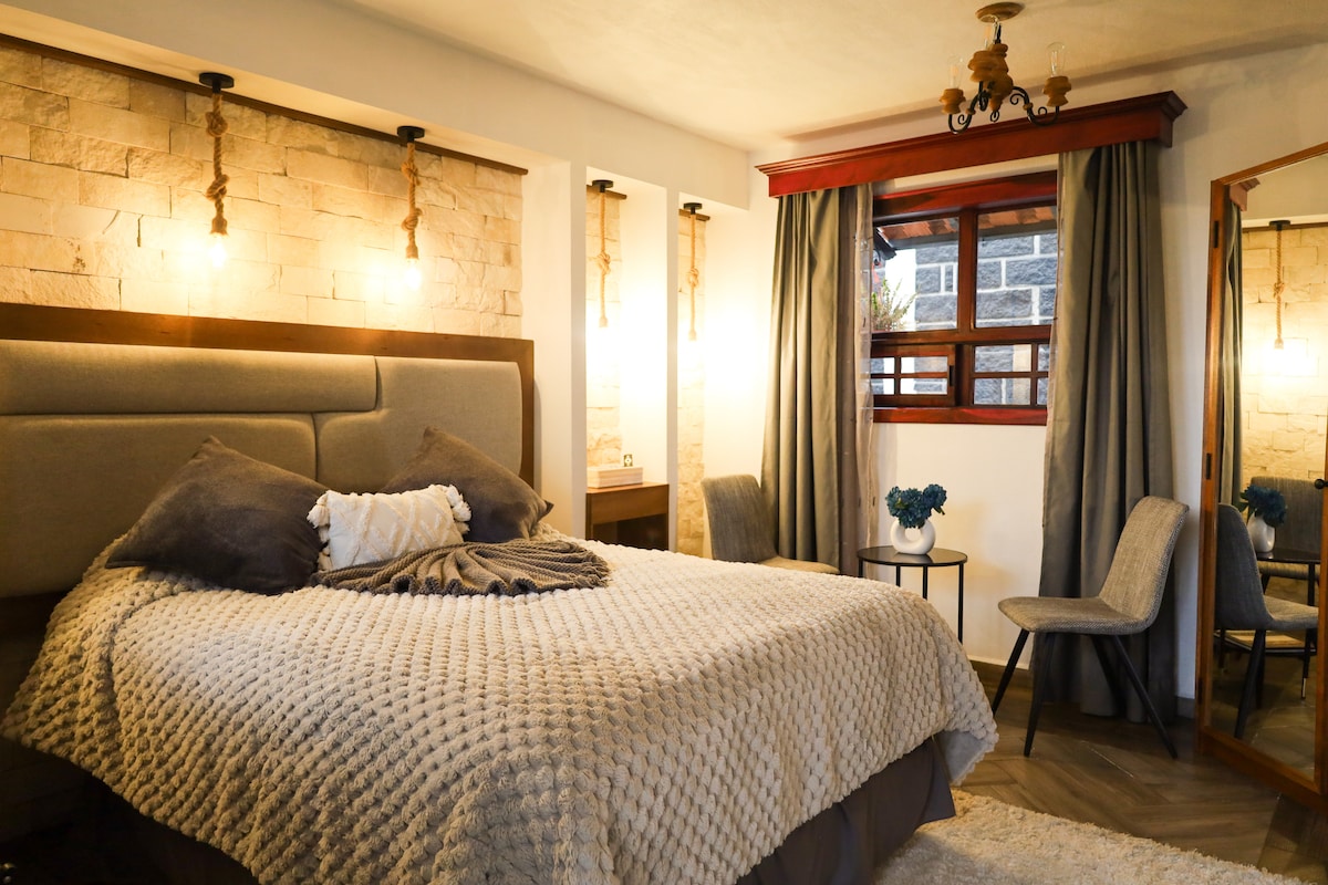 I-Liverpool ikunikeza isimo esifudumele nesamukelekayo, esinomklamo ovelele ngenxa ye-headboard yayo enhle yamapulangwe eqoshiwe enezela ubuciko bendawo. Isihlalo esithokomele sinezela ukunethezeka okwengeziwe, kuyilapho i-nightstand yamapulangwe, ehambisana ne-headboard, iqedela indawo, inikeza ikhona elihle lokungcebeleka nokujabulela ukuhlala okunokuthula e-Real del Monte.