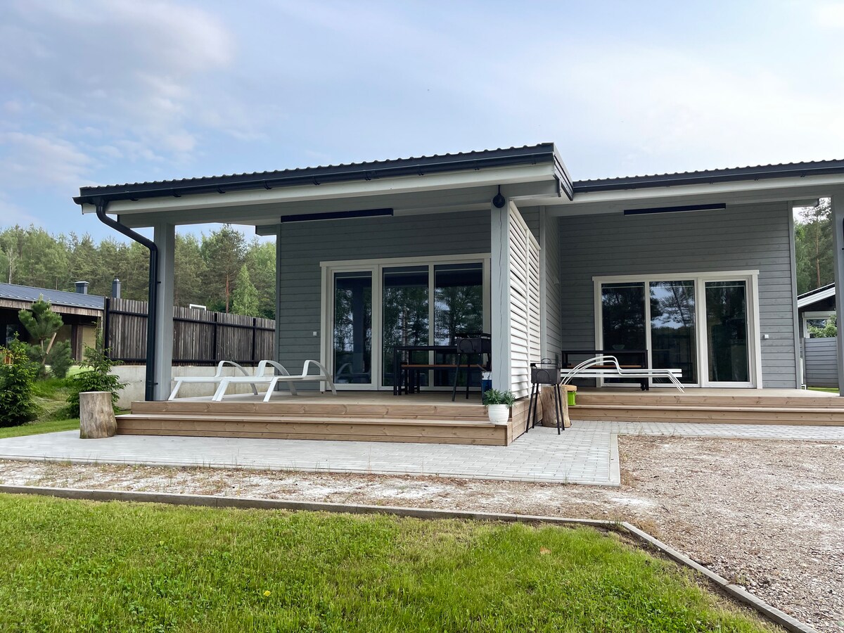 Indlu eyakhiwe ngamapulangwe ethokomele ehlathini eduze kwechibi i-Kertuoja