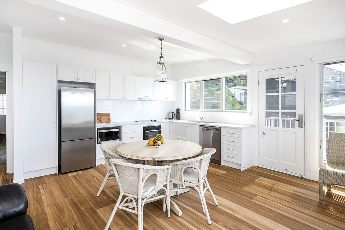 Indlu ye-quintessential weatherboard beach, enemibono yokufela, ukuphumula lapho ufika. Ukukhanya okugcwele futhi kuhlotshiswe ngesitayela esinethezekile, esogwini, indlwana ihlotshiswe kahle ngokubukwa kwamanzi kuzo zonke izindawo zomphakathi. Ilungele imindeni Indlwana isendaweni eyodwa ngakho ungahamba kalula usuka endlini uya emphemeni. Indawo, indawo enhle nendawo yangaphandle ihlukile kakhulu.# Cliff Avenue Mollymook Beach, ku-Bannisters Head. Silandele ku- @thecottagemollymook