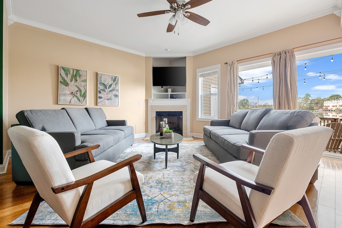 Okubabazekayo 4 BR-2.5 yokugeza echibini townhouse ngaphesheya komgwaqo kusuka Tanger Outlets, ukuhamba ibanga Coliseum, IGALOFU PHEZULU (evulekile Jan 2023), ukuphonsa azembe, dining, 2.5 mi esikhumulweni sezindiza, 8 mi kuya endaweni yokudlala igalofu, 6 imiz kuya Park Circle futhi 10 imiz kuya edolobheni Charleston. 14-acre echibini nge ibhola yokudoba futhi dock lapho ungakwazi ukugwedla ibhodi noma ujabulele turtles. Ubhavu we-Jacuzzi kubhavu omkhulu. Ama-deck ezindaweni eziphansi ze-1 & 2. Ukuzijabulisa kwesitezi sesithathu nge-70 ku-TV, imidlalo, izincwadi, nomdlalo we-arcade.