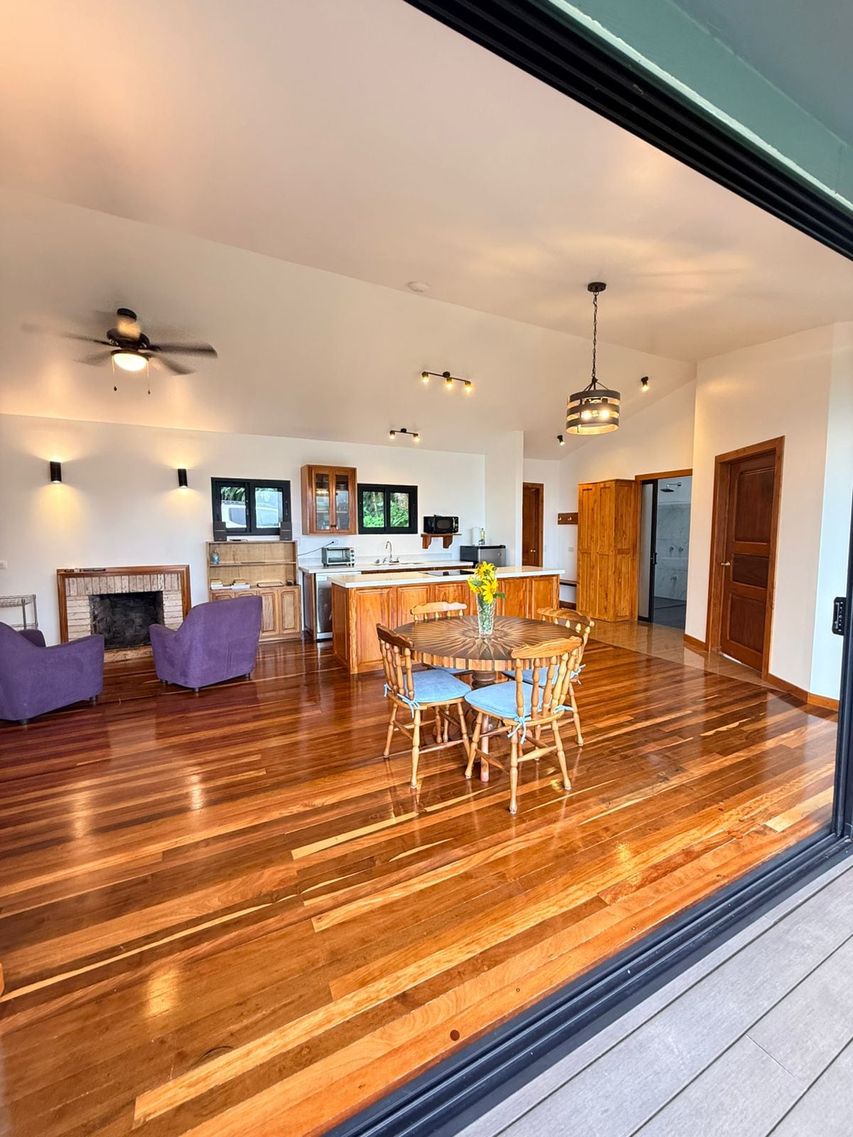 Oct 25: We have just completed a full remodel of this lovely house. It now has two bedrooms, full bath, kitchen, deck, and laundry room all on one level and with wide doors to make it wheelchair friendly. My mother built this as her retirement house. She wanted a cozy, comfortable, house with a beautiful view. Wood floors, fireplace with firewood provided for the chilly Monteverde nights, beautiful windows so that you are looking down on the tops of the trees in the river gorge.