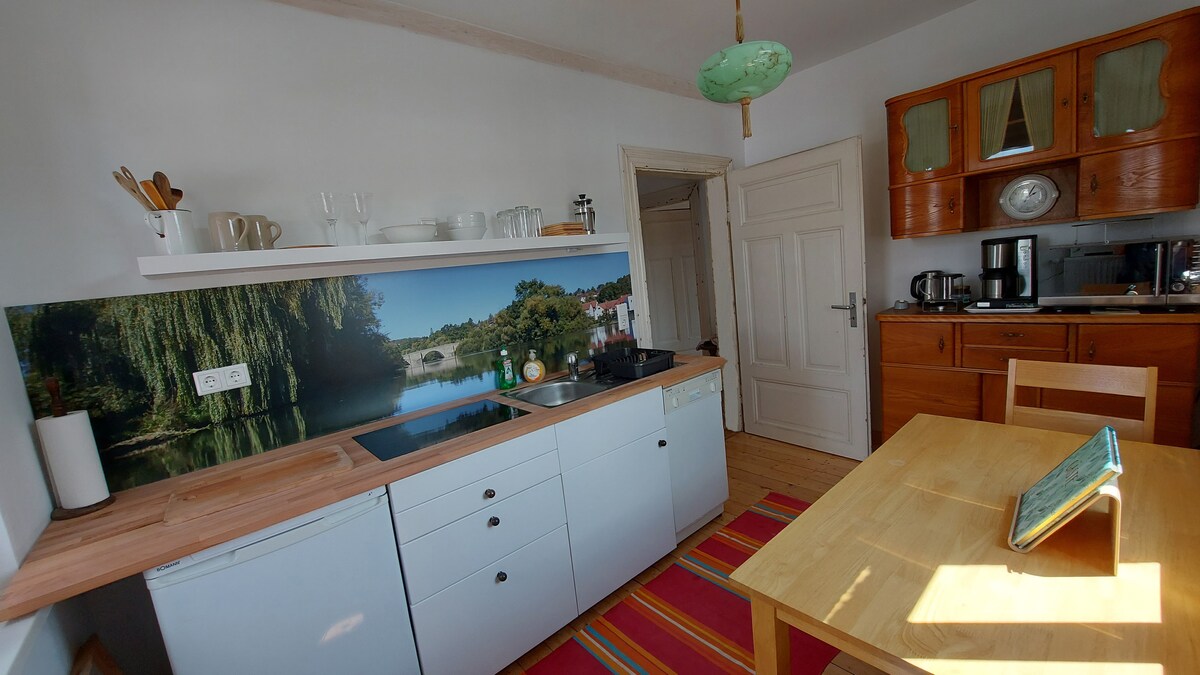 Ifulethi elisanda kulungiswa elingu-125 m ² lihlaba umxhwele kuphela ngendawo yalo eyingqayizivele ngokuqondile ku-Fulda ezintabeni zaseNorth Hesse. Esigayo esineminyaka engu-400 ubudala, leli fulethi lalinefenisha yothando oluningi. Inekamelo lekhishi elivulekile lesimanje elinezindawo zokuhlala eziseduze lapho indawo yomlilo yenza indawo emnandi. Ngaphezu kwalokho, efulethini uzothola amakamelo amabili okulala abiyelwe kanye negumbi lokugezela elisanda kulungiswa ne-sauna. Isistimu yokushisisa eqhubekayo
