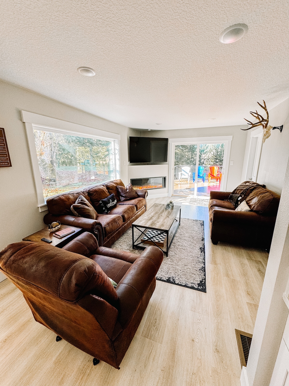 Fenview Retreat in Government Camp, Oregon, is a luxurious, family friendly mountain escape with two bedrooms, two full ensuite bathrooms, and concealed bunk beds in the living room to comfortably accommodate families and friends. Govvy is known for its proximity to excellent skiing and other outdoor activities. Staying at Fenview Retreat puts you steps from the lifts and tubing at Mt. Hood Skibowl East in the winter and Adventure Park in the summer.