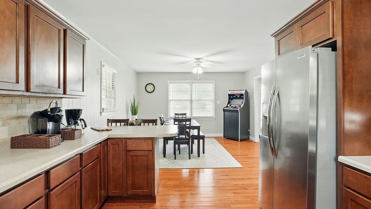 Ikamelo lokulala eliphumuzayo elingu-3 nekhaya lokugezela elingu-2 eliqhele ngebanga elingamakhilomitha angu-1 ukusuka eNyuvesi. Izindawo eziningana ezikhangayo nezindawo zokuthenga nokudla ziqhele ngemizuzu embalwa. Amasevisi: ✔ I-King Bed + 2 Queen Bed ✔ I-Arcade Machine w/1,000 imidlalo Ikhishi ✔ eligcwele/elinesitokwe esiphelele ✔ I-firepit enesitofu se-Solo Igceke ✔ Elikhulu Langemuva ✔ Umshini Wokuwasha/Umshini Wokomisa Eduze Nakho Konke: ✔ 1 Mile To Murray State University ✔ 16 Miles to Kentucky Lake ✔ 16 Miles To Kenlake State Park ✔ Amakhilomitha angu-25 Ukuze Ufike Phakathi Kwamachibi ✔ 47 Miles To Paducah