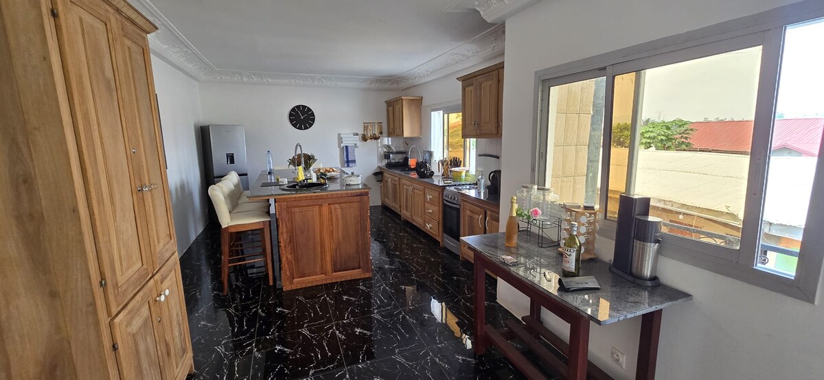 Très grande et majestueuse maison familiale à Ebolowa. Terrain entièrement clos, 7 chambres climatisées, gardien 24/7 et service complet inclus dans le prix. Cette maison est idéale pour passer des vacances. Elle accueille très confortablement jusqu'à 14 personnes qui pourront profiter de ses 3 salons et du grand jardin. Idéalement située cet hébergement élégant et statutaire est parfait pour passer des moments merveilleux en famille. Electricité et eau sont garantis par un forage à 90 mètres.