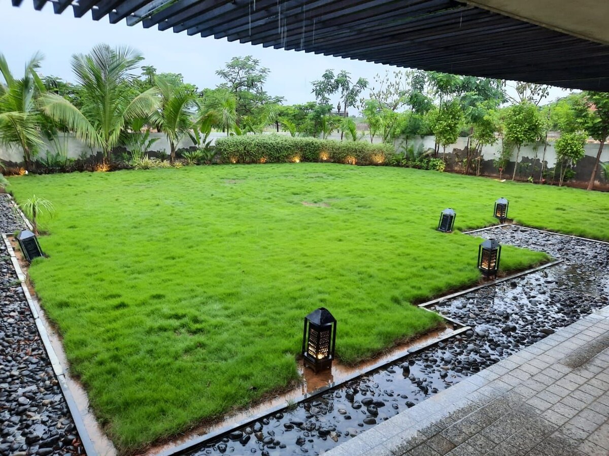 Relax with the whole family at this peaceful place to stay. A 6,000 sq. ft. villa with four luxurious bedrooms, a large living room, and a kitchen. Amenities include: television, utensils, fridge, washing machine, dishwasher, mixer, safe lockers, gas, oven, and board games. Enjoy access to a clubhouse with lawn tennis, badminton court, swimming pool, and beach volleyball court. Just 15 minutes from the city. Strictly not allowed non-vegetarian food, smoking, and alcohol.