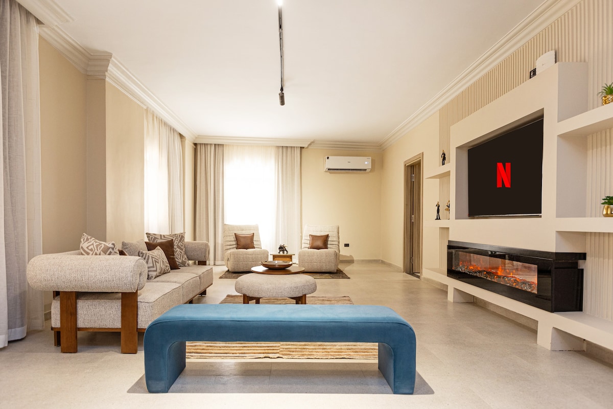 Our modern penthouse with a private pool is perfect for families seeking convenience and luxury. Located in a gated community in the upscale area of New Cairo, just 30 minutes from the airport, and close to amenities like KFC, Starbucks, and a variety of Western and local restaurants (Chili's, Fuddruckers, LongHorn Texas, Ibn Al Sham). Amenities like a King Bed, washer, dryer, dishwasher, and microwave ensure comfort, and 4 smart TVs provide entertainment.