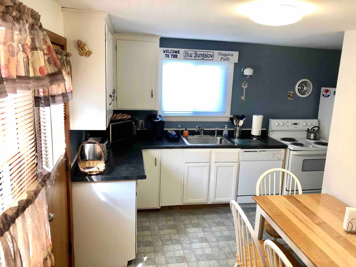 Ngiyakwamukela ku-Blue Bungalow. I-Honeymoon Capital of the World. Quaint & hlanza 1 phansi uhlelo indlu yonke yangasese kakhulu & ilala 2. 1 umzuzu uhamba uye Casino & Ezokuzijabulisa District of the City of Niagara Falls, NY. 10 imizuzu ukuhamba kuya Falls State Park. Sondela kakhulu ukuthi ngobusuku obuthulile ungazwa uMfula i-Niagara enamandla njengoba iphazamiseka phezu kwe-Forest Falls. Leli khaya lihlezi endaweni ephindwe kabili ukuze inikeze izivakashi zethu indawo eluhlaza engenakuqhathaniswa. Kuhlanganisa ukupaka emgwaqweni nawo wonke amasevisi asekhaya.