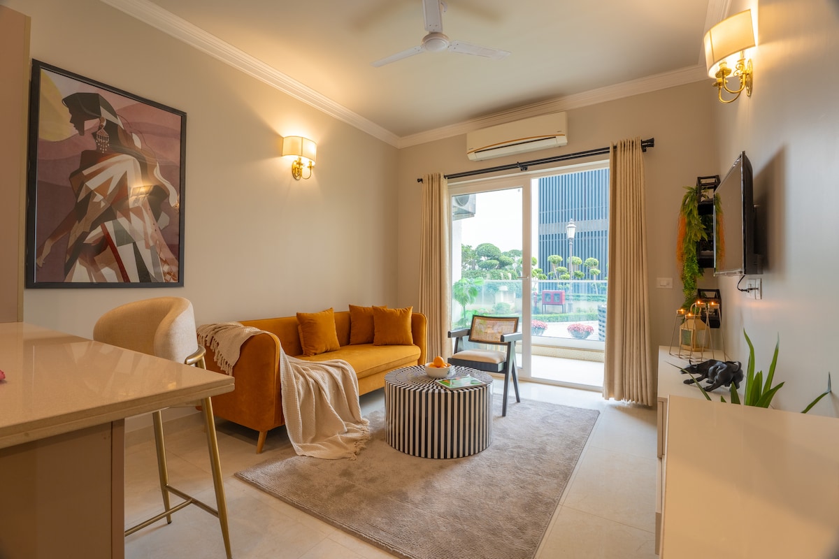 Vuka ubone izindawo ezinhle zase-Aravalli kule fulethi enesevisi ye-1BHK e-Central Park Flower Valley - indawo yokuhlala enokuthula, enesitayela se-resort e-Gurugram kodwa ikude nomsindo wasedolobheni. Jabulela igumbi lokuphumula elithokomele, ikhishi elinakho konke, negumbi lokulala elizolile elivulekela kuvulande omkhulu onokubukeka okuhle okuthokozisayo. Izivakashi zingakwazi ukusebenzisa indawo enkulu yokubhukuda, indlu yeklabhu, nendawo yokudlela ekahle ebheke indawo enamanzi athulile.