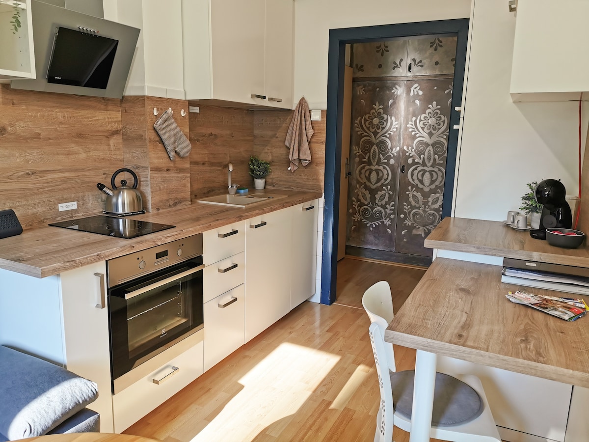 Uyemukelwa ku-Naive Home, ifulethi elinomphefumulo. Lesi situdiyo esithokomele esine-AC sise-Bratislava Old Town, esinombono omangalisayo weSonto Elilungisiwe. Isikhungo somlando, izitolo, izindawo zokudlela - konke idolobha elingakunikeza sekusele kancane. Leli fulethi lithule (ngisho noma isitobhu sethilamu siseduze) ngoba libheke egcekeni elithulile. Imihlobiso ye-Naive Home igqugquzelwa imihlobiso yabantu, konke kudwetshwe ngesandla. Sitholakala esitezi sesibili esinekheshi esakhiweni esihlala abantu