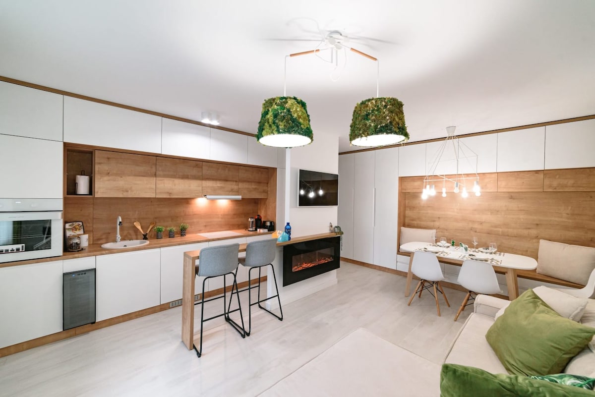 Ngena engadini yethu yasedolobheni, indawo enhle kakhulu edidiyelwe umhleli wokuhlobisa ngaphakathi. Ihlotshiswe ngezitshalo eziluhlaza ezilengayo ne-lichen, ihlanganisa imvelo nedizayini ngokungenaphutha. Izinto ezenziwe ngokhuni lwemvelo zinikeza umuzwa wokufudumala, kuyilapho ikamelo lokulala elithokomele negumbi lokugezela elibizayo, elinobhavu ozimele, kunikeza ukunethezeka nokuthula.