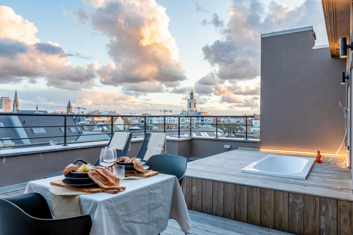 Ifulethi elilungiswe ngokuphelele elingu-110m2 labantu abangu-4 esitezi se-10 sesakhiwo esidumile enkabeni ye-Ostend. Ibanga lokuhamba ngezinyawo ukusuka esiteshini. Ukubukeka okuhle kolwandle, ulwandle nedolobha. I-sunny terrace nxazonke. Ilungele ukuhlala okunethezekile ngasolwandle: -sauna -2 amakamelo okulala ane-smart TV Amagumbi okugezela angu -2 - Ikhishi elihle elinohhavini wesitimu, i-Nespresso... -I-WiFi esheshayo Ifenisha ye-terrace Indawo emaphakathi eduze nebhishi, isiteshi sesitimela, izindawo zokudlela nezitolo: imoto ingamane ihlale endaweni yokupaka.