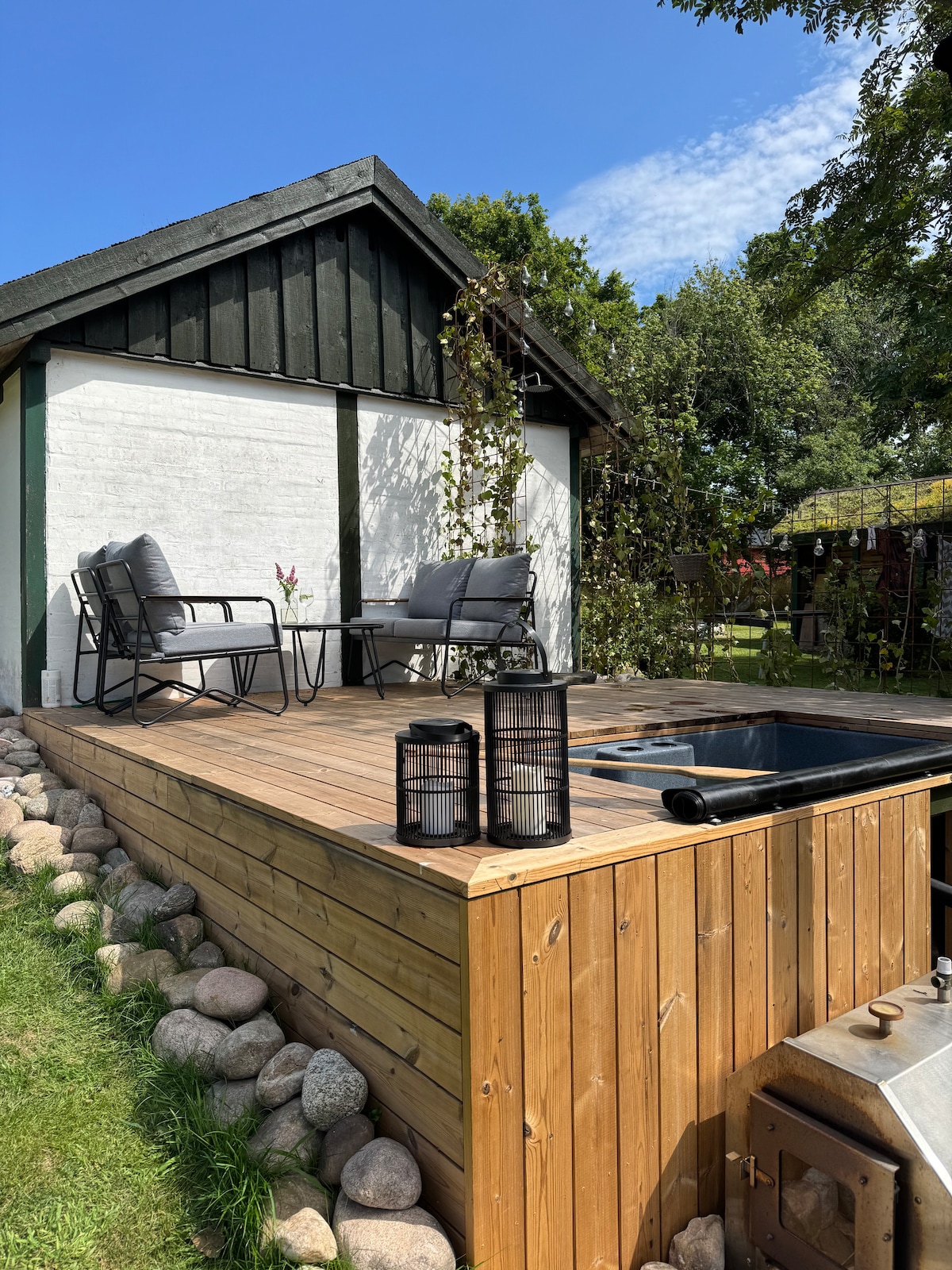 Indlu enhle yamapulangwe yase-Sweden, esiqeshini esikhulu somhlaba. Kunekhishi elihle elingaphandle elinendawo yokosa inyama nosinki. Kuneshawa yangaphandle eshiswa ngamandla elanga. Kunamabhayisikili atholakalayo endlini: ibhayisikili elilodwa elihlanganisiwe, amabhayisikili amabili ezintaba, ibhayisikili elilodwa lamadoda, namabhayisikili amabili abesifazane, kanye nethreyila lebhayisikili. Ithoyizi elidonswayo lezingane ezincane. Kunegumbi lokulala elinombhede ophindwe kabili, igumbi elinombhede ongu-3/4, kanye negumbi elinama-bunk bed, lapho omunye umbhede ungumbhede omncane ophindwe kabili. Kukhona ne-loft enkulu. Indawo yokukhosela engadini ukuze ulale ngaphandle. Kukhokhiswa u-DKK 3 nge-KW ngayinye yogesi. Izivakashi zizohlanza ngaphambi kokuphuma endlini.