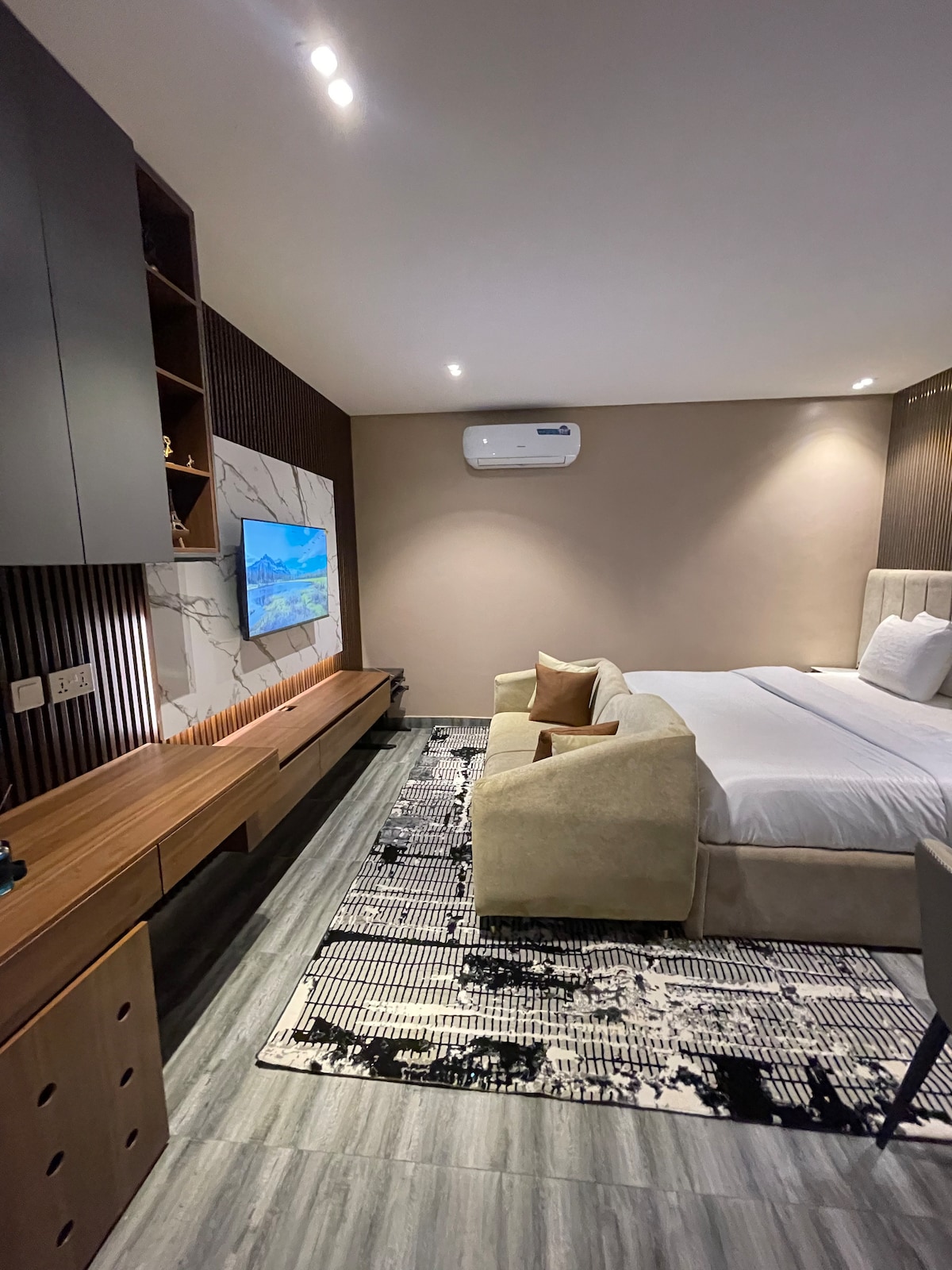 Jabulela umuzwa wehhotela lezinkanyezi ezingu-5 ngokunethezeka kwekhaya kuleli fulethi elisanda kulungiswa elisesitezi sesibili. Ikamelo lokulala negumbi lokuphumula ngalinye line-TV, ehlukaniswe ngamaphaneli okhuni lwe-mahogany. Jabulela indawo yakho yokuhlala ephrayivethi, i-AC, ifriji, i-smart TV engama-intshi angu-55, kanye nekhishi lesimanjemanje elinesitofu esinamabhunu angu-4. Indlu yokugezela inamanzi ashisayo, anengcindezi, ugesi ukhona 24/7, kunezokuvikeleka ubusuku nemini, futhi i-Wi-Fi eshesha kakhulu ilungele izivakashi ezisebenzayo.”