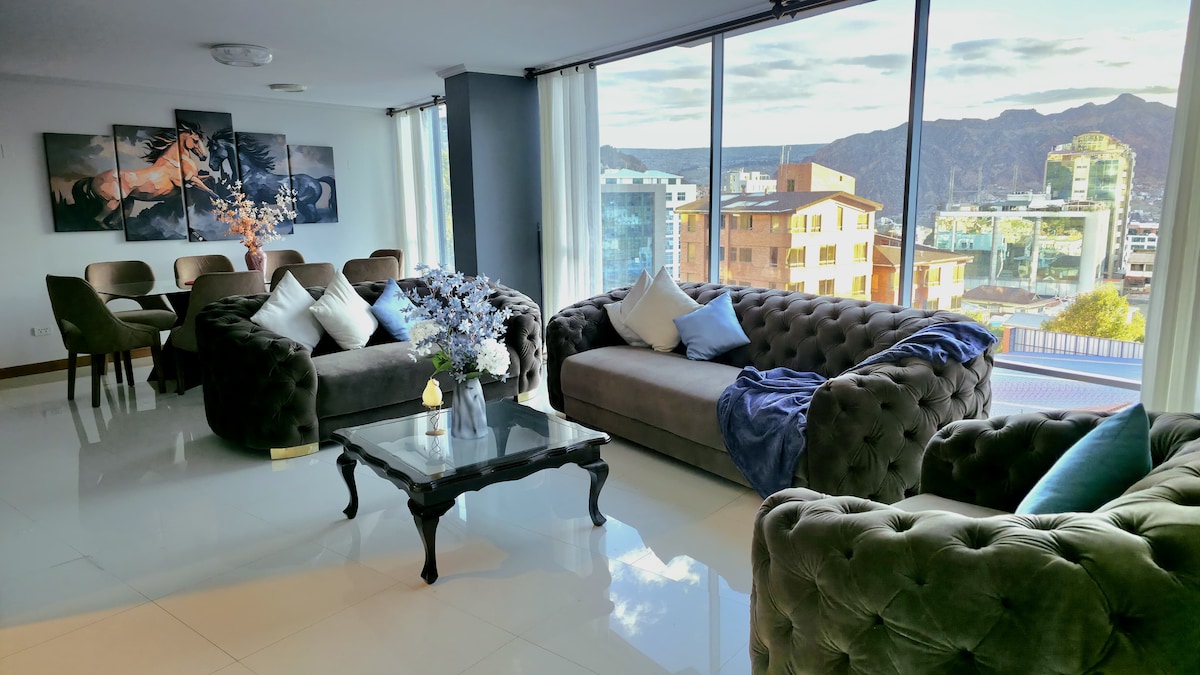 Ifulethi likanokusho elimangalisayo elingu-3BR endaweni ephephe kunazo zonke e-Calacoto, imizuzu engu-4 kuphela ukusuka e-San Miguel. Amamitha-skwele angu-2,000 anezindawo ezibabazekayo, amafasitela amaphaneli amabili, nokushisisa okungavamile. Ifaka ifenisha entsha, amagumbi okugezela angu-4, indawo yokuhlala/yokudlela evulekile, i-master suite ene-spa ne-TV, igumbi le-TV elinombhede kasofa, i-Wi-Fi enejubane eliphezulu, igumbi lelondolo, nekhishi lompheki. Hamba ngezinyawo uye ezindaweni zokudlela ezihamba phambili, ezitolo zokudla nezitolo. Okuhamba phambili e-La Paz!