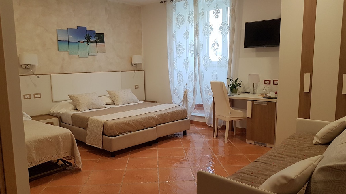 Camera con vista mozzafiato in Palazzo d'Epoca nel cuore del centro storico di Agropoli La parte alta e più caratteristica del paese Il corso principale, i bar della modvida e il porto distano 5 minuti a piedi In totale nell'edificio ci sono 6 camere a disposizione degli ospiti, un terrazzo panoramico e un giardino vista mare dove viene servita la prima coalzione