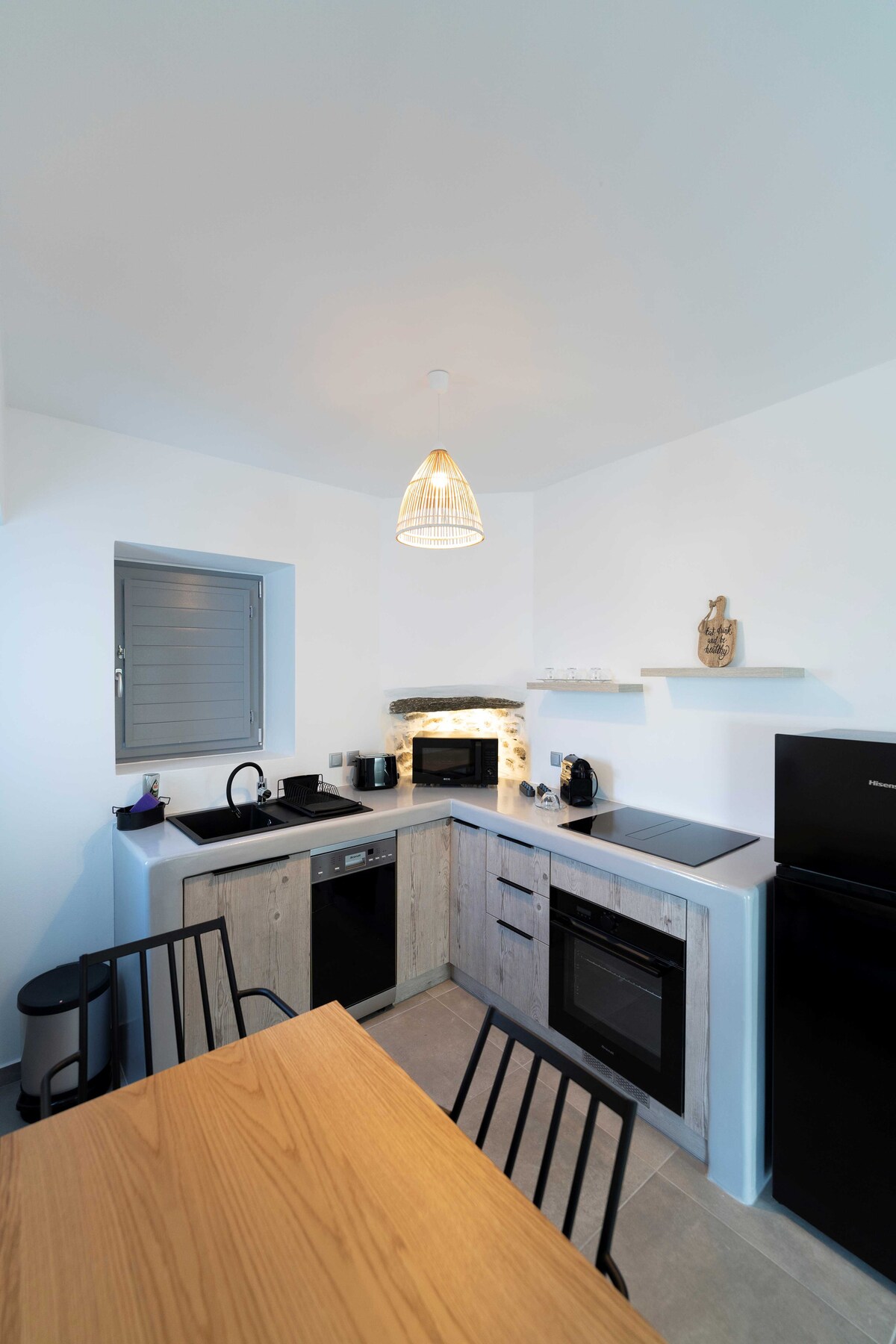 Ifulethi elinamagumbi okulala elilungiswe ngokuphelele elinombono wokubuka ulwandle ngaphambili. Umbhede ophindwe kabili ekamelweni lokulala, ikhishi elinakho konke (uhhavini, ifriji, umshini wokugeza izitsha, izindawo zokupheka ezingu-4), indlu yangasese eneshawa, umshini wokuwasha, uvulande wangasese onezihlalo netafula. Ukungena kuvulande ohlanganyelwayo onokungena okuqondile olwandle (amatshe) lapho izivakashi zingazibhukuda khona ekuseni. Ukubuka ulwandle ngaphambili egumbini lokuphumula nasekamelweni. Izinyathelo ezimbalwa ukusuka enkabeni ye-Ermoupolis.