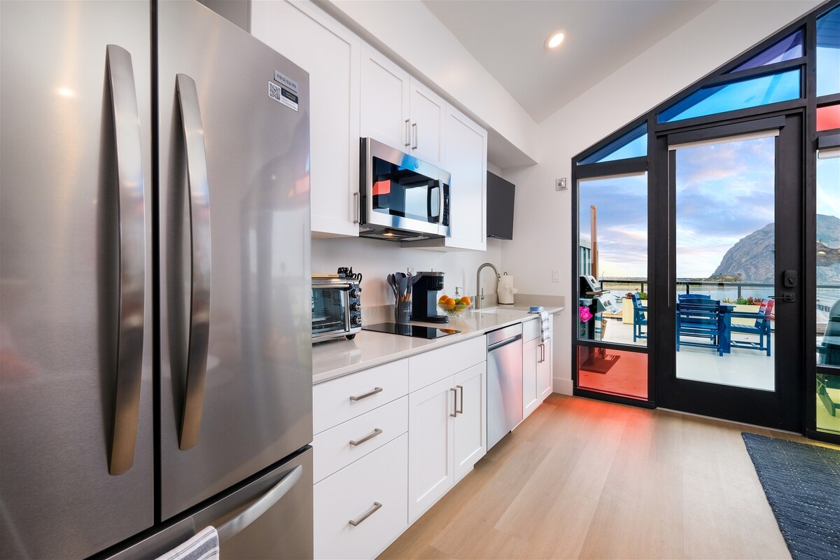 Modern Myster-Sea is a stylish 2 bed, 2 bath oceanfront home in downtown Cayucos—just steps from the sand, shops, pier, and restaurants. Enjoy stunning ocean views from the open-concept living, dining, and kitchen areas. Bedrooms and 1 bath are upstairs; a 2nd bath, laundry, and garage access are downstairs. Includes shared garage, Smart TV (YouTube TV, no cable), queen air mattress. No BBQ. Access requires stairs via private hallway.