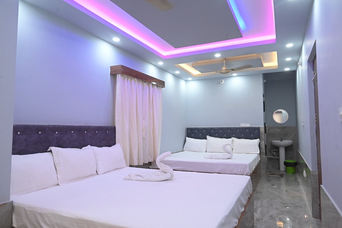 Cozy 1BHK just 4 mins from ISKCON Mayapur! Enjoy AC, clean double bed, private bath, extra double bed, wardrobe, and a temple view from the terrace which is right outside the room. Peaceful, walkable location ideal for devotees, families, and solo travelers. Optional kitchen. Sunrise over the temple makes your stay special. Book now for a divine and comfortable visit to Mayapur!* Early Check-in and Late Check-out options available on request.