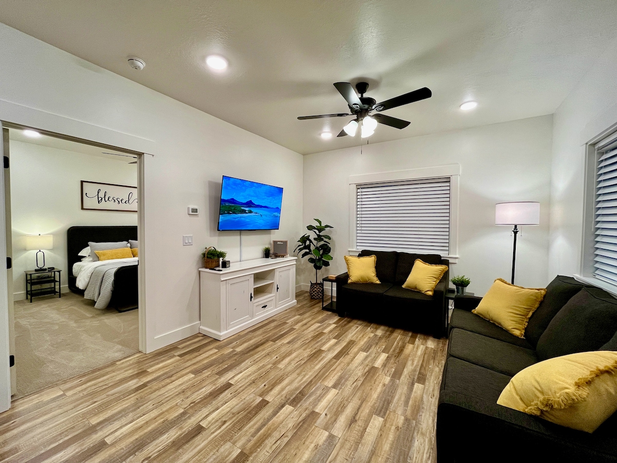 Ungabe usabheka kude! Ifulethi elinekamelo lokulala elilodwa elinawo wonke amasevisi endaweni enokuthula! Ngaphansi kwemizuzu engu-5 uhamba ngemoto kusuka e-USU, Ukuthenga, Izindawo zokudlela, namapaki. Imizuzu engu-40 uhamba ngemoto ukuya kuma-ski resort, imizuzu engu-2 uhamba ngemoto ukuya e-USU, kanye nebhayisikili lasezintabeni e-Green Canyon. Ngaphakathi kweFulethi uzothola ikhishi elivulekile nendawo yokuhlala, ikamelo lokulala elihle, ilondolo eligcwele, kanye negumbi lokugezela. I-WIFI esheshayo, ne-Smart TV. Akukho ukungena kokuxhumana. Ilungele ukuhlala isikhathi eside noma isikhathi esifushane! Ukupaka kulinganiselwe emotweni eyodwa.