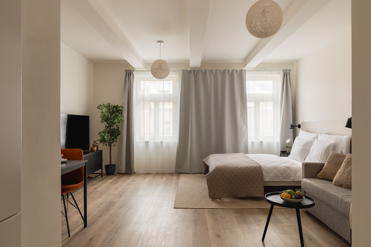 Ifulethi le-Penthouse endaweni yokuhlala yase-Prague umhume wamatshe usuka esikhungweni sezomlando. Ifulethi liza namasevisi agcwele ahlanganisa ikhishi lokunethezeka elifakiwe, indlu yokugezela enobhavu neshawa ehlukile, imibhede emibili emikhulu enamabhokisi amabili kanye nethala elikhulu lelanga. Ifulethi lihlotshiswe ngokucophelela, libonisa uthando lomnikazi wobuciko nokuklama. Ukuhamba ngemoto kwemizuzu engu-20 ukusuka esikhumulweni sezindiza, ukupaka okukhokhelwayo phambi kwesakhiwo, namamitha angu-300 ukusuka esikhungweni somlando. Ngamafuphi ifulethi lamaphupho.