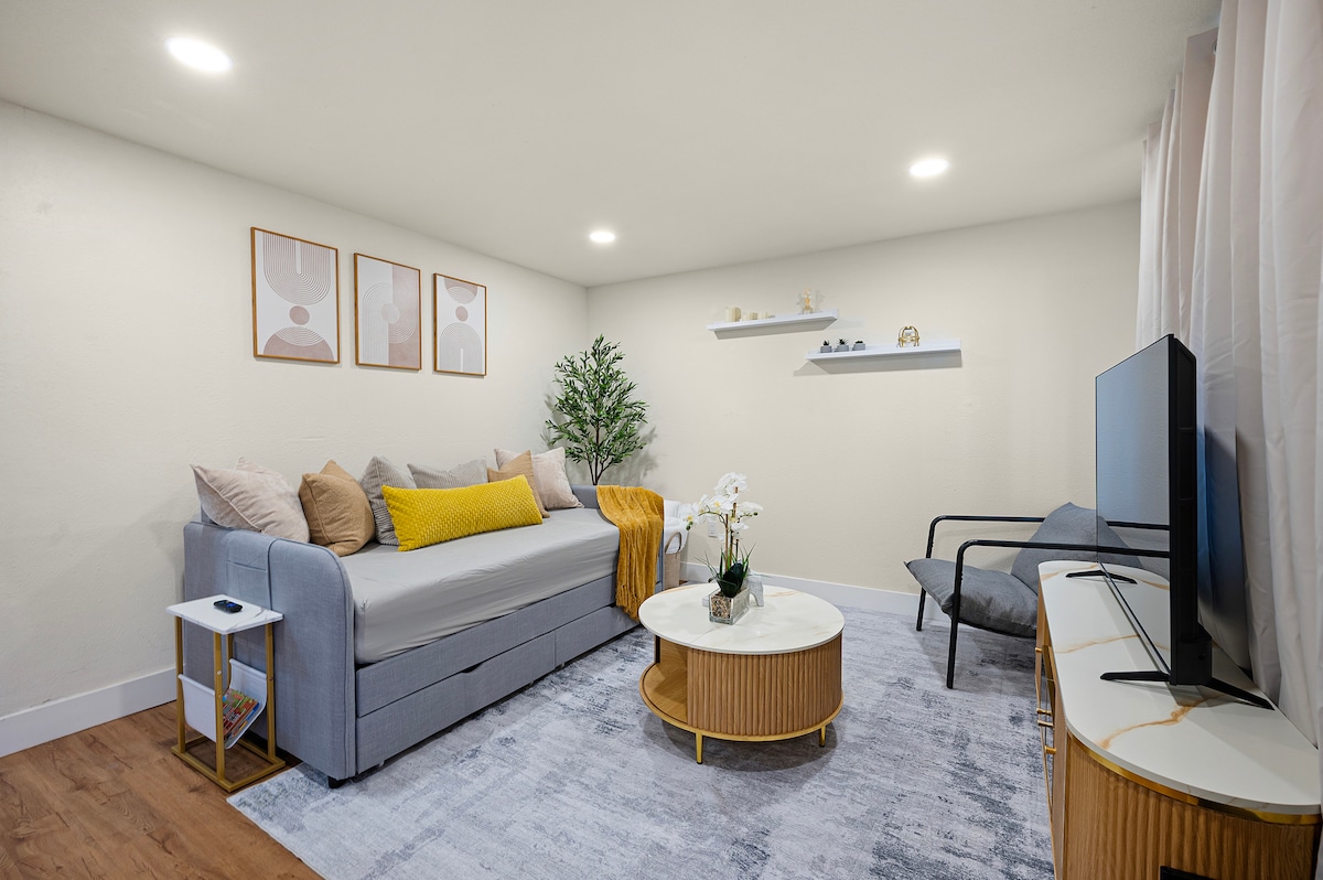 Relax in this cozy, modern 1-bedroom retreat designed to feel warm, clean, welcoming and accommodates up to 4 guests. Recently remodeled with stylish touches and comfortable furnishings, it's the perfect home away from home. Conveniently located in Lakewood, Washington just minutes from Joint Base Lewis-McChord, hospitals, shopping, and dining.