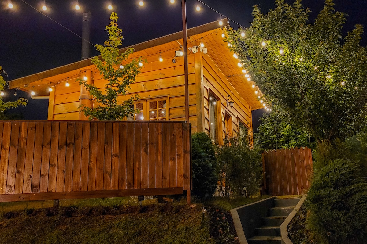 Indlu yeholidi eyakhiwe ngokhuni enobhavu wamanzi ashisayo, indawo yokubasa umlilo nendawo yokosa