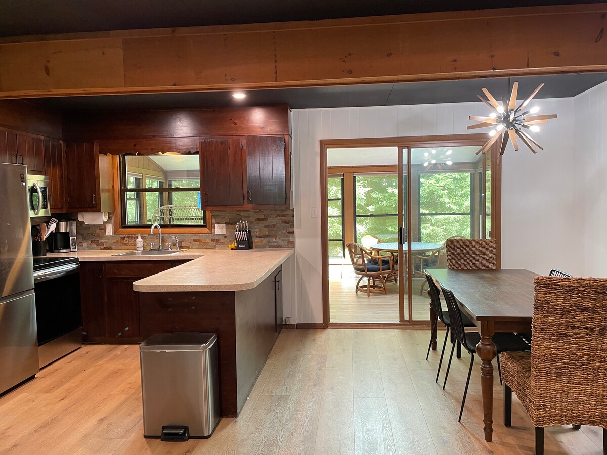 Kubuyekezwe kahle 3 Igumbi lokulala, 1.5 Bath Cottage uhlezi emgwaqweni omuhle othulile ngaphandle nje kweLake Naomi e-Pocono Pines. Leli khaya linezindawo eziphansi zezinkuni ezilungiswe kahle, izindlu zokugezela zesimanje, igumbi lokudlela, Igumbi lomdlalo (ama-arcades netafula lokubhukuda) & igumbi lokuphumula elihle elinomlilo. Ikhishi elisha eline-S.S. Appl & Granite counter phezulu ! Hamba uye emphemeni omuhle nobhavu wamanzi ashisayo noma ujabulele ikhofi emphemeni wangaphambili ohlanganisiwe. Ikhaya yi-Wifi Ilungile, Isikhala sehhovisi siyatholakala, Imidlalo Eseceleni, ne-Grill yamalahle