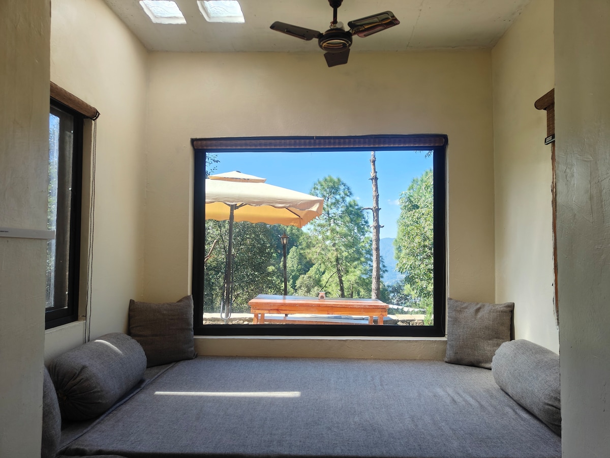 A frame intimacy, balcony sunrise, quiet corners. Made for couples who love slow mornings. Work ready, power ready, phone optional. Raya feels cozy and close. The balcony is the hero here, tea and first light every day. Simple interiors, warm wood, and a clear view set the tone. WiFi is fast, power is backed up, and there is a tidy workspace if you need it. Drive time from Delhi is nine to ten hours. Kathgodam is the nearest rail. Free parking. Best for couples and anniversaries.