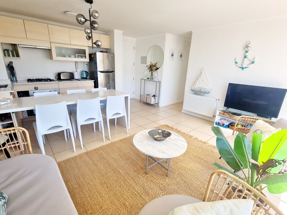 Idepho enhle nethokomele ephambi kolwandle, esendaweni engaphambili ye-Reñaca, ehlomele ngokuphelele abantu abangu-2, inakho konke okudingayo ekuhlaleni kwakho, i-ParkingPrivadoYseguro, i-BedroomEnSuite, i-Living RoomComedorConFuton, i-TerrazaFrenteMar, i-Wifi, i-TVcable, i-GrillElectric, i-Binoculars, i-RestoBarExclusiveEdificioExcellent value for money. Ilungele ukusebenza ukude nokungcebeleka phambi kolwandle, uxhumano oluhle lwe-wifi. !cuentaConPiscinaTemperadaJacuzziRestobarTodoLoQueQueNecessitasEnUnSoloLugar!