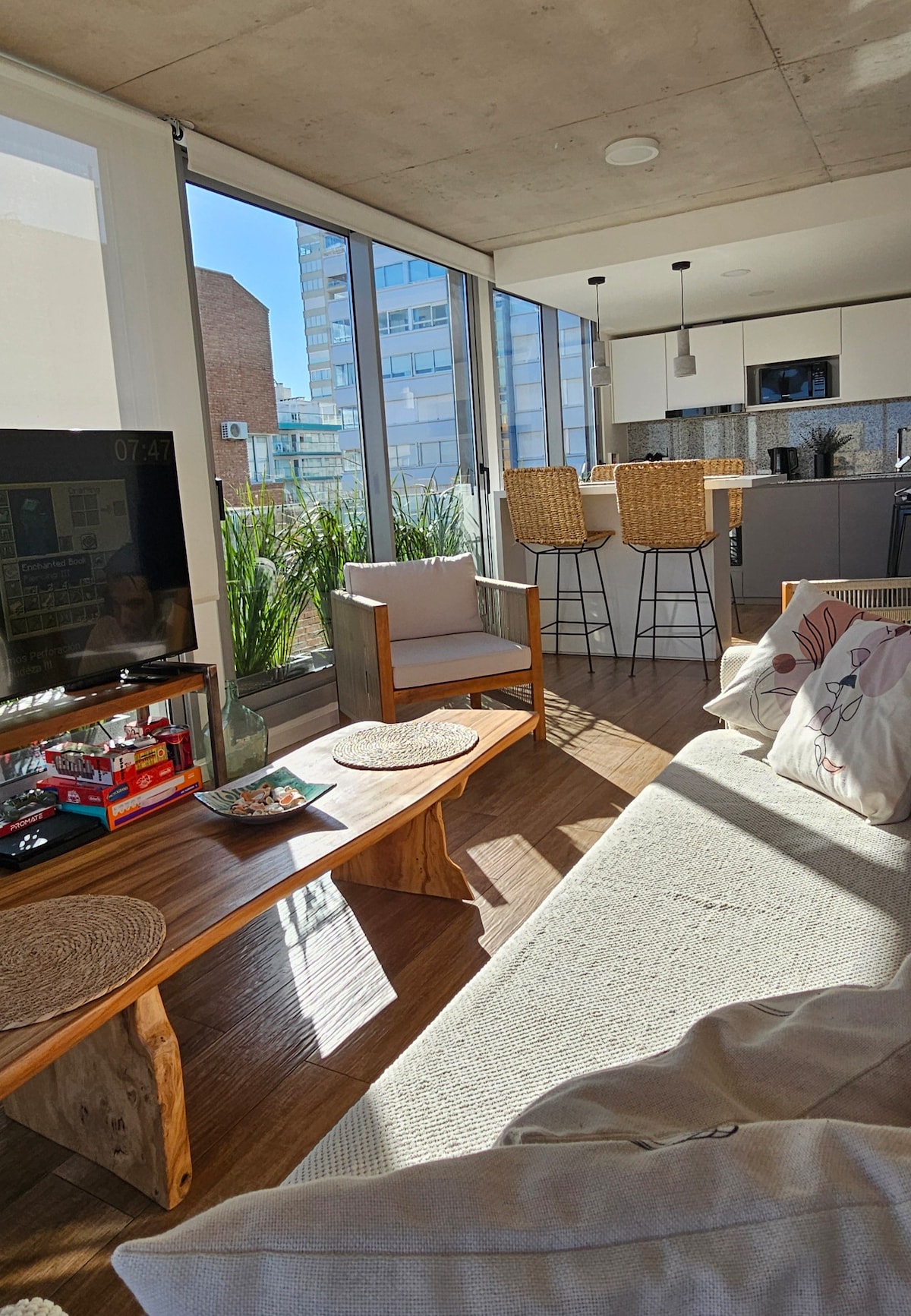 Hermoso y moderno apartamento frente al mar Parada 27 de la playa mansa súper luminoso. Dos habitaciones (una en suite), dos baños, capacidad 5 personas, cocina equipada completa. Living comedor integrado a gran terraza con parrillero y excelente vista! Incluye Wi-Fi y ropa blanca Garage para un auto AMENITIES • Barbacoas ubicados en el Rooftop del edificio • Piscina exterior climatizada • Solarium • Gimnasio: local equipado con caminadoras, spinning y multifuncionales.