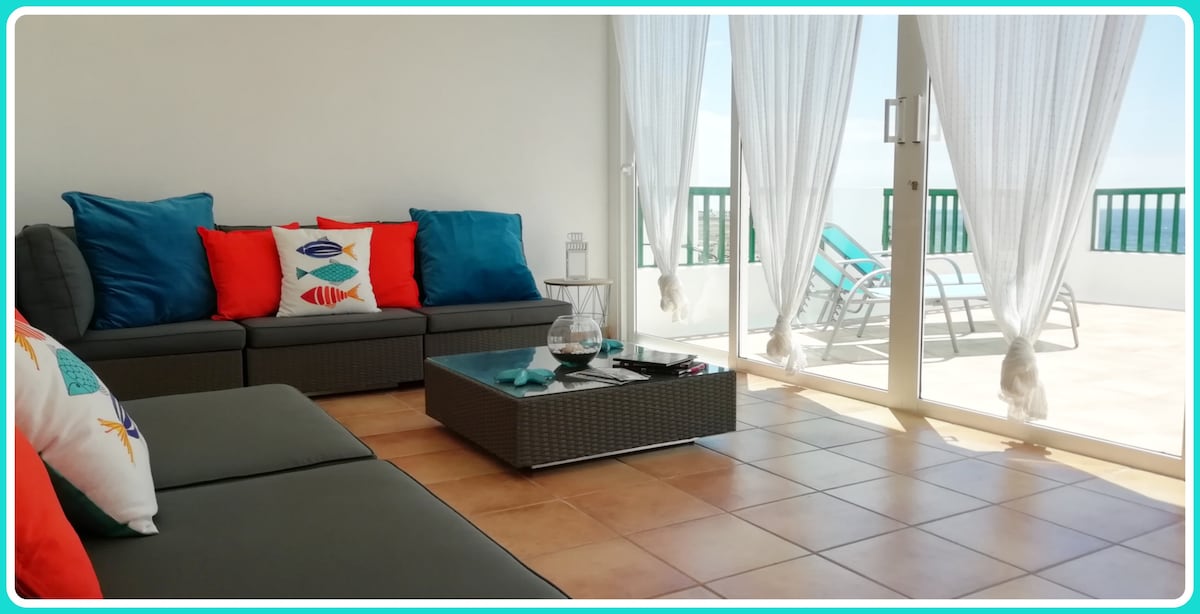 Die wunderschöne Villa verfügt über einen Raum mit spektakulärem Blick aufs Meer, auf Playa Blanca und auf die benachbarte Insel Fuerteventura. So beginnt der Tag schon grandios beim Frühstücken. Die großen Schiebetüren mit getönten Scheiben können zur Seite geschoben werden. So dass man nicht nur dort Essen kann, sondern den ganzen Tag und abends über eine windgeschützte, schattige offene Pergola mit Meerblick verfügt. Entspann dich in dieser besonderen und ruhigen Unterkunft.