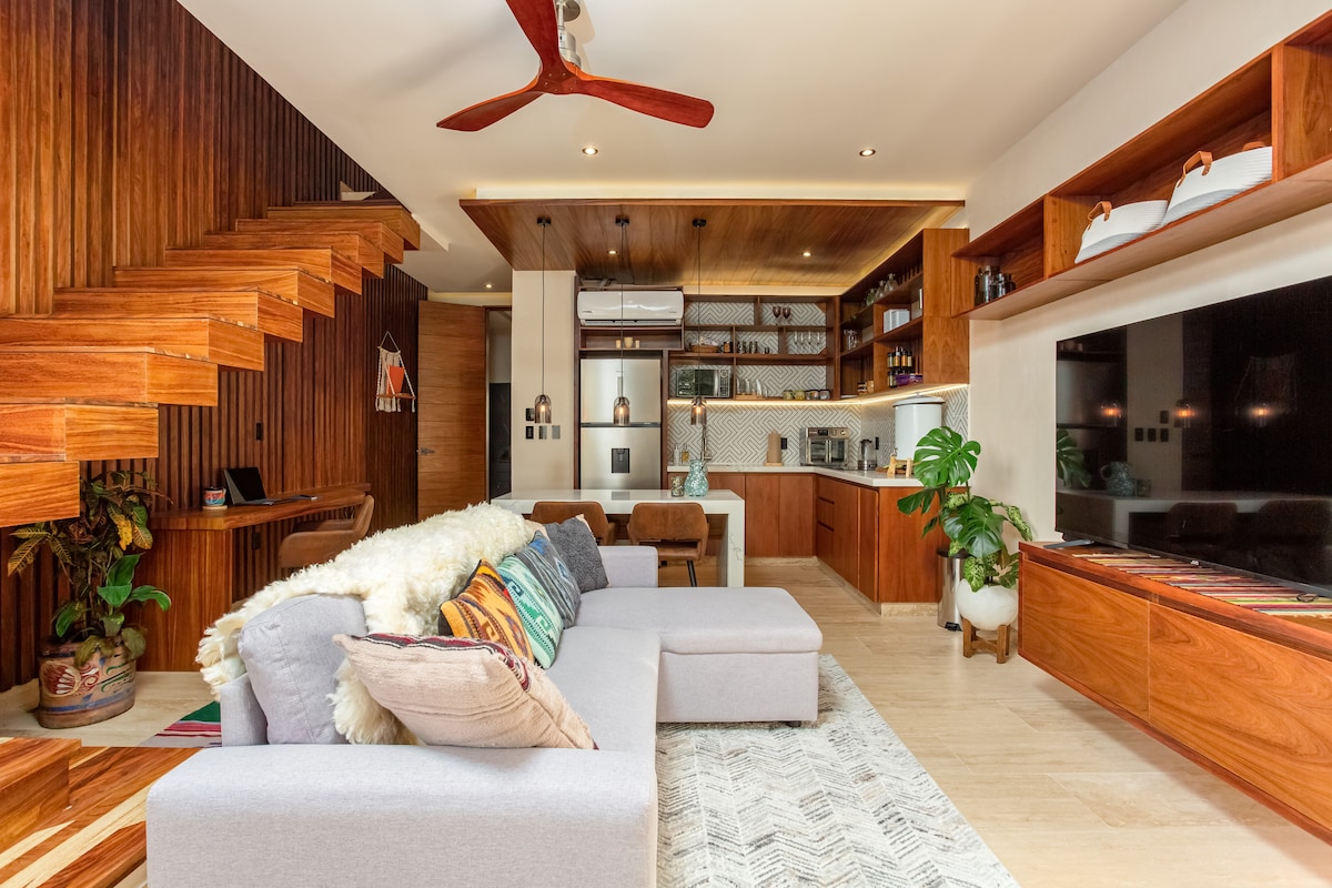 I-Luxury 2BR/2BA penthouse emphakathini wegalofu onezitezi. Kulala kuze kufike ku-8 ngefenisha enhle, i-Wi-Fi esheshayo, nomshini wokuwasha/wokomisa ngaphakathi kuyunithi. Izinzuzo ze-resort: izindawo zokubhukuda ezingenamkhawulo, ijimu ne-sauna, i-yoga/i-spinning, ukusebenza ndawonye, ikilabhu yezingane, izinkundla zokugwedla, nama-hammock, kanye nendawo yokudlela esendaweni kanye nendawo yokubhukuda. Hamba ngezinyawo uye ku-5th Ave yase-Playa del Carmen, ama-boutique, nokudlela. Ilungele imindeni noma amaqembu-vele nje ufike futhi uphumule.
