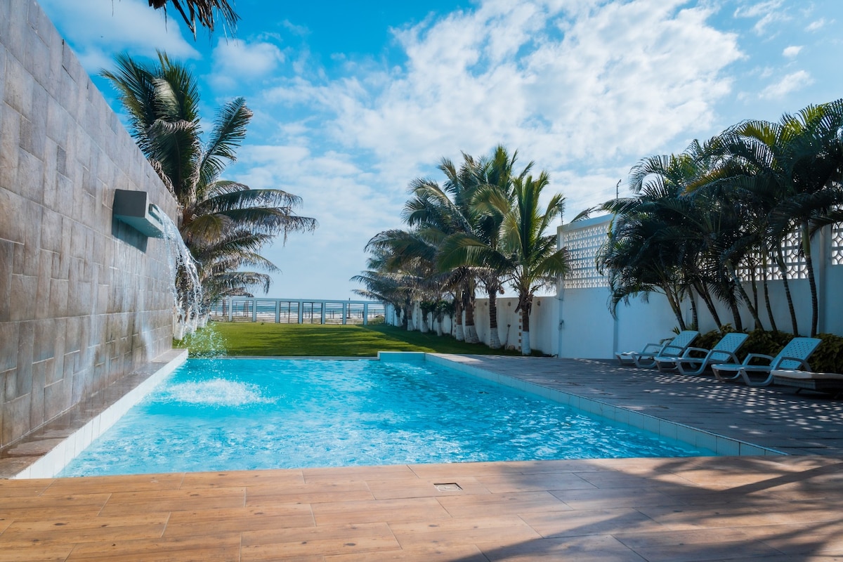 I-Spectacular Ocean front Luxury Suite. Ukubheka ukushona kwelanga Ilungele imindeni yezingane ezingaba ngu-3. I-Build Pool ne-Private Jacuzzi Ukungena ebhishi nesevisi ye-parasol nezihlalo ezinomsizi. I-Elevator Ikamelo elikhulu elilodwa elinendlu yokugezela egcwele nemibhede engu-2 kasofa endaweni yegumbi lokuphumula enegumbi lokugezela eliphelele. Ikhishi elilungisiwe elinazo zonke izitsha ezidingekayo nezinto zasekhishini. Amanzi ashisayo 1 Indawo yokupaka yangasese I-Private Safety ne-Garita ngaphakathi kwenkimbinkimbi 24/7