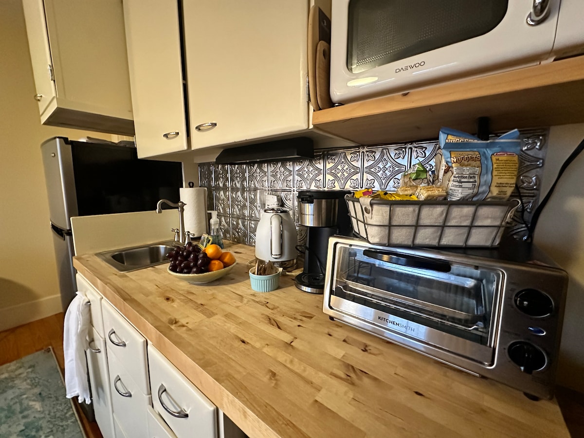 Everything in this suite is clean and tidy. There is plenty of natural light and privacy blinds. There is Wifi with YouTube, Prime and other platforms. There is also a kitchenette in the unit with sink, small refrigerator, microwave oven, toaster oven, hot plate and pans and coffee maker. The house sits on a third acre of land and is fenced in from the road. We are a ten minute walk to the beach and shopping area, and the train station is located only two blocks away.