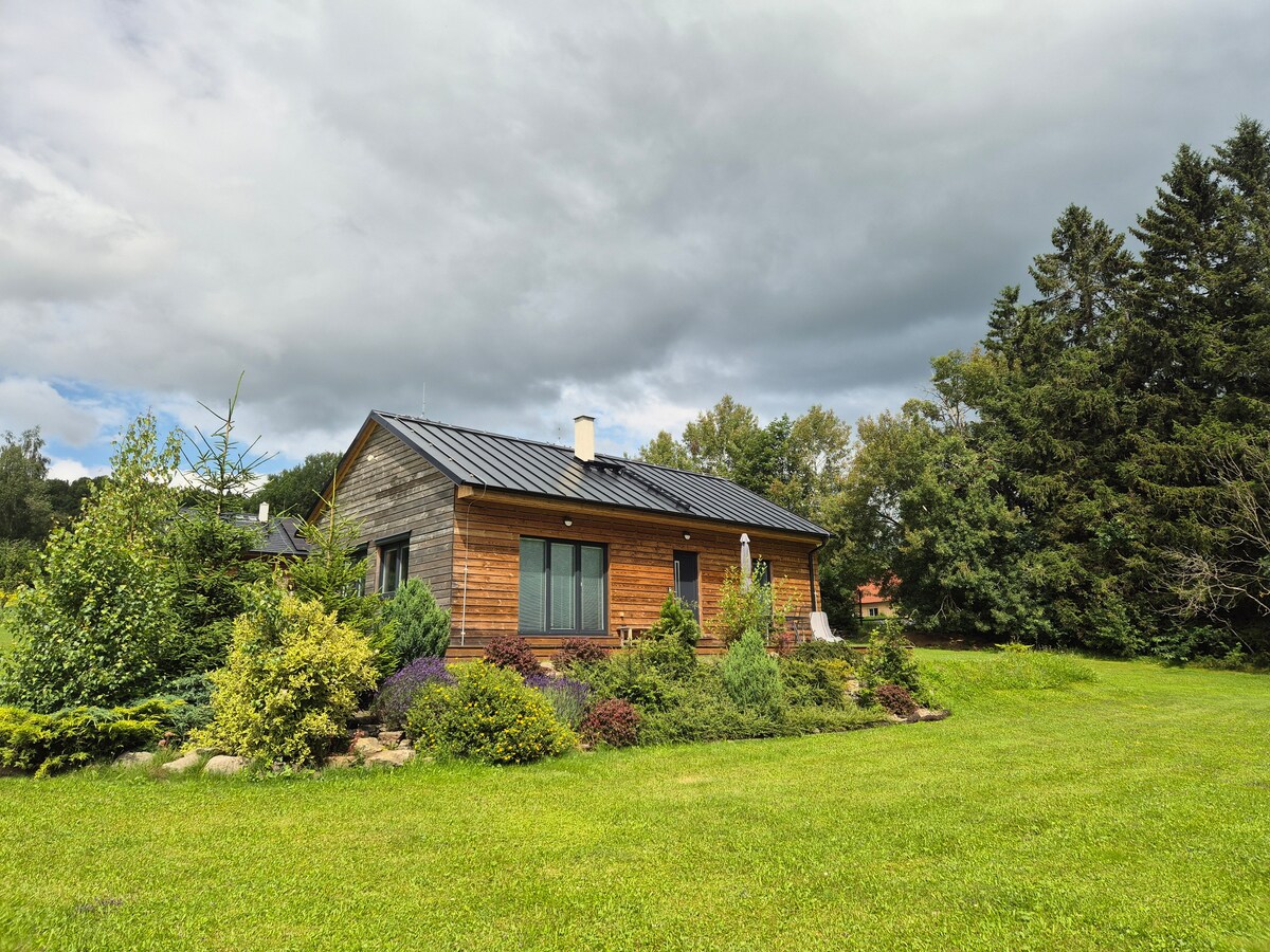 Indlu yeholide eyakhiwe ngamapulangwe enkulu enamakamelo angu-2 + enamagumbi okugezela angu-2 ne-WC, igumbi lokuphumula elikhulu elinendawo yokubasa umlilo, ikhishi elinakho konke, i-sauna nendawo yeshawa. Ngaphandle, uvulande ovikelekile, indawo yokupaka, indawo yokudlala nendawo yokosa kanye nethala lamapulangwe eline-Jacuzzi, indawo yokuphumula nezihlalo zamadekhi. Umbhede wengane (60x120) ngesicelo sika-250czk/ubusuku Izilwane ezifuywayo ezincane zivunyelwe ngaphandle kwamakamelo anesengezo esingu-2000czk/ukuhlala + Idiphozithi 5000czk (okufanele ikhokhwe esayithini)