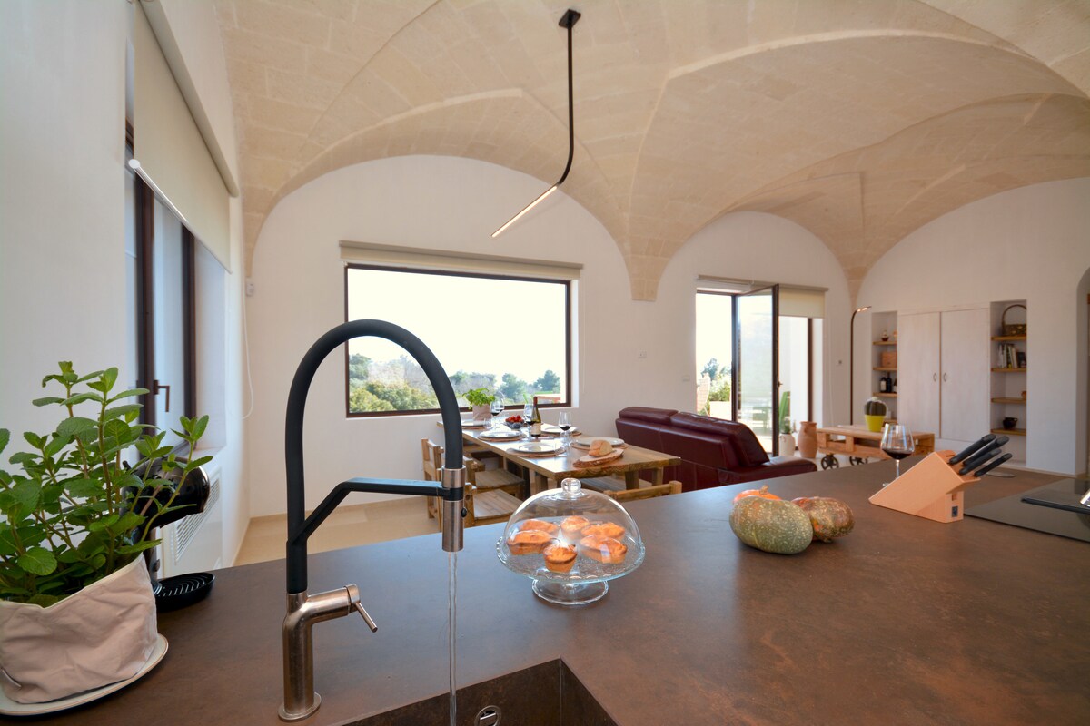 I-villa, esanda kwakhiwa, ingesiko lokwakha le-Salento, elinomphongolo nama-vaults ezinkanyezi. Indlu igxilile engadini yaseMedithera engamamitha-skwele angaba ngu-7,000. ngokuqondene nokuzola nobumfihlo, indawo yokubhukuda, i-shower yangaphandle, uvulande , indawo yokosa. Izindawo zangaphakathi, ezine-air conditioned: - umbhede owusofa wegumbi lokuphumula (ulala abantu ababili), onekhishi elincane eligcwele - amakamelo amabili okulala (lapho kunombhede owodwa owengeziwe, amagumbi okugezela amabili aphelele eshaweni, elinye lawo liyi-suite.