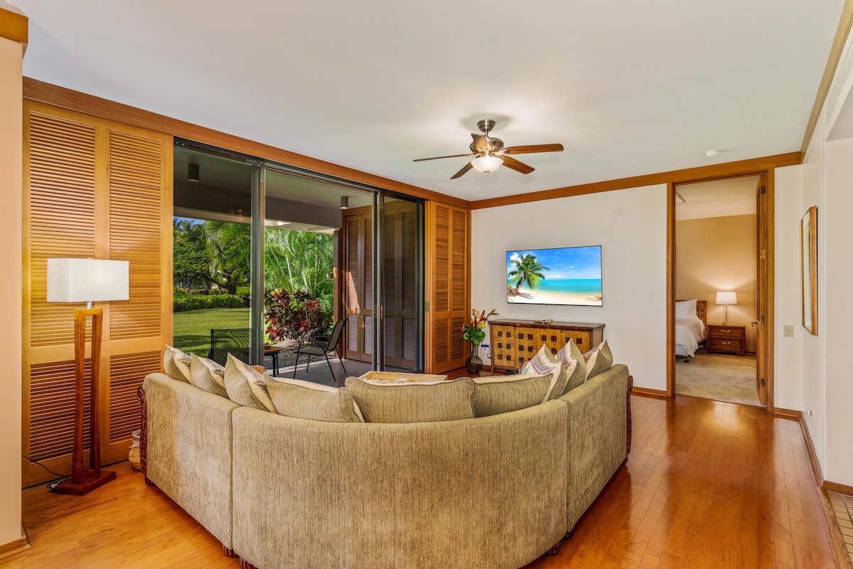 Jabulela ukuhlala kwakho kule ndawo ephansi, elungiswe kabusha ku-2023, ikamelo lokulala elilodwa elilodwa ekhoneni leyunithi yokugezela efulethini kwenye yendawo engcono kakhulu yase-Waikoloa Beach Resort. * Ukuhlobisa indawo enkabazwe enamachibi nezimpophoma * Eceleni kwendawo yokubhukuda, inkundla yethenisi, i-BBQ nesikhungo sokuzivocavoca * Hamba uye ebhishi, ezitolo, izindawo zokudlela, izinto zokuzijabulisa ne-Grand Hilton * I-WiFi yamahhala esheshayo. I-Central A/C. Umshini wokuwasha nowokomisa. * I-Spectrum Cable ne-Roku streaming TV * Indawo yokupaka yangasese yamayadi angu-50 ukusuka emnyango wangaphambili