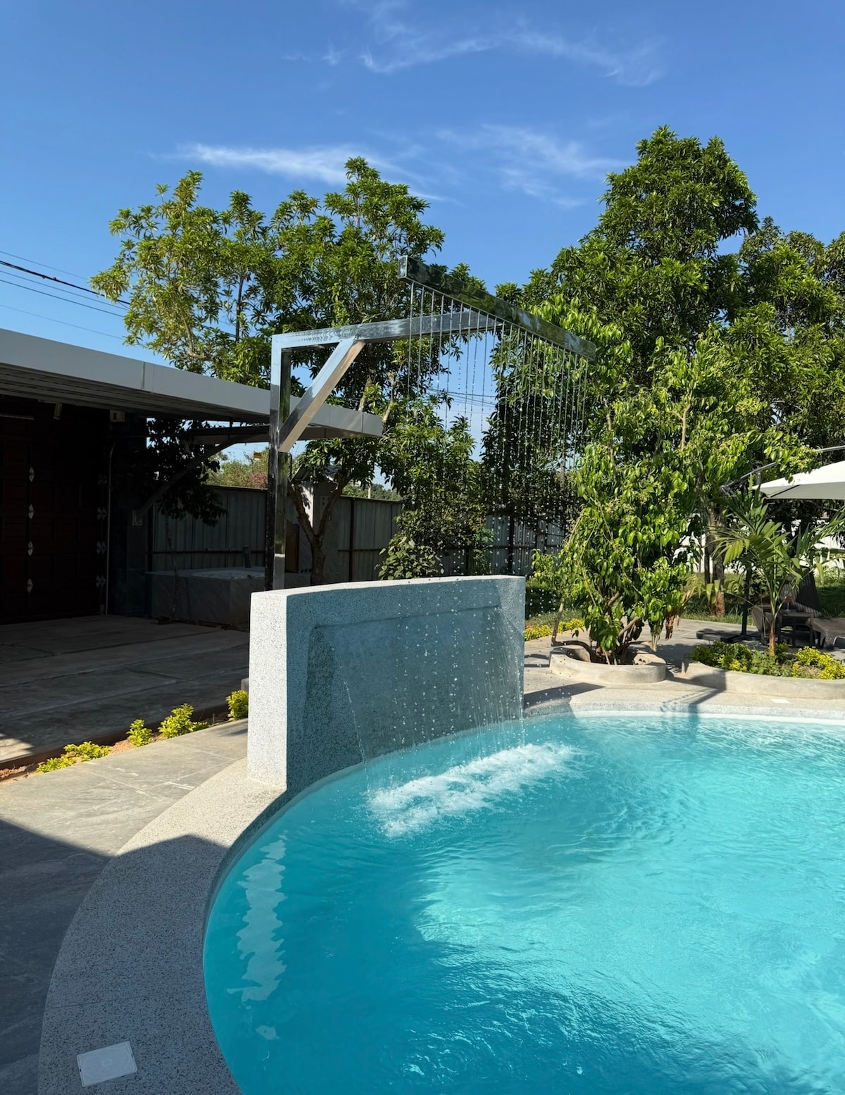 Indlu eyakhiwe ngamapulangwe engasechibini ene-pool