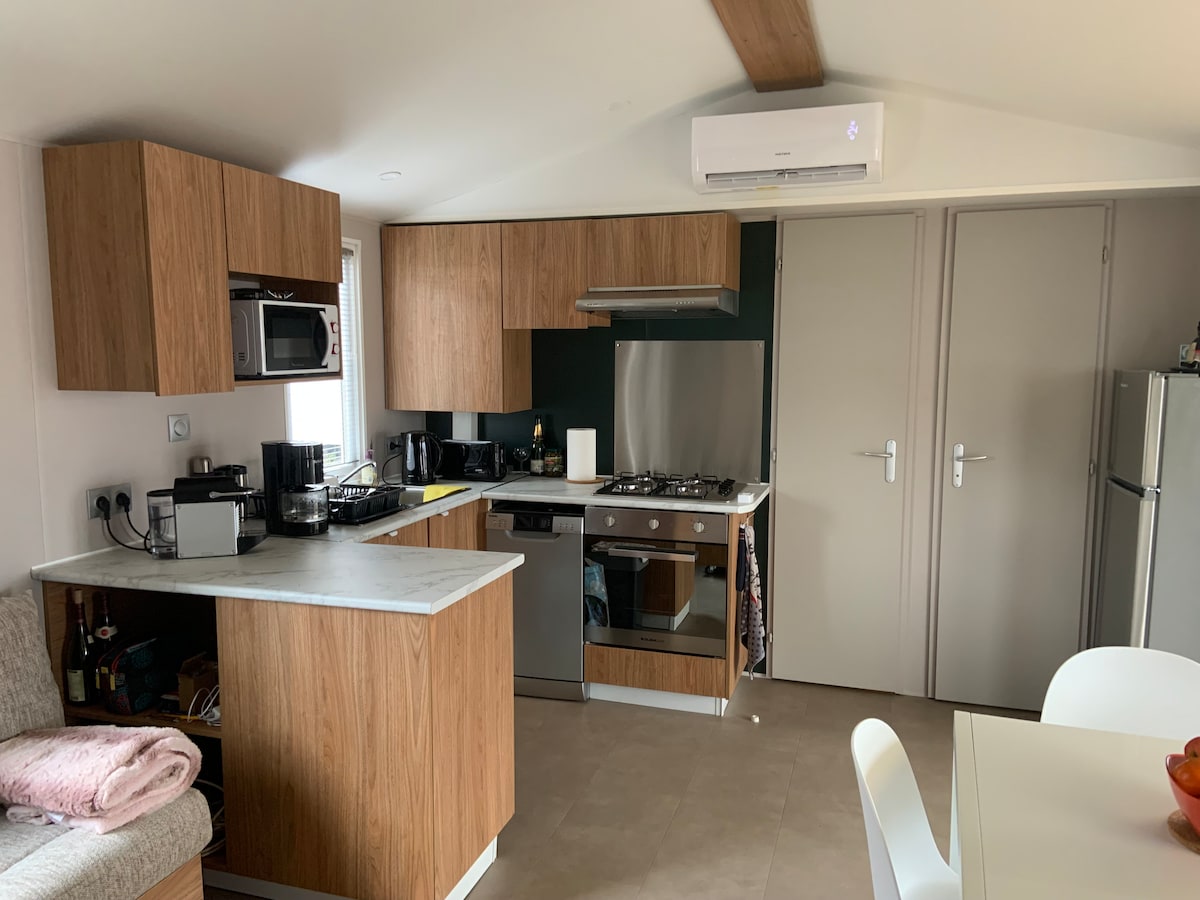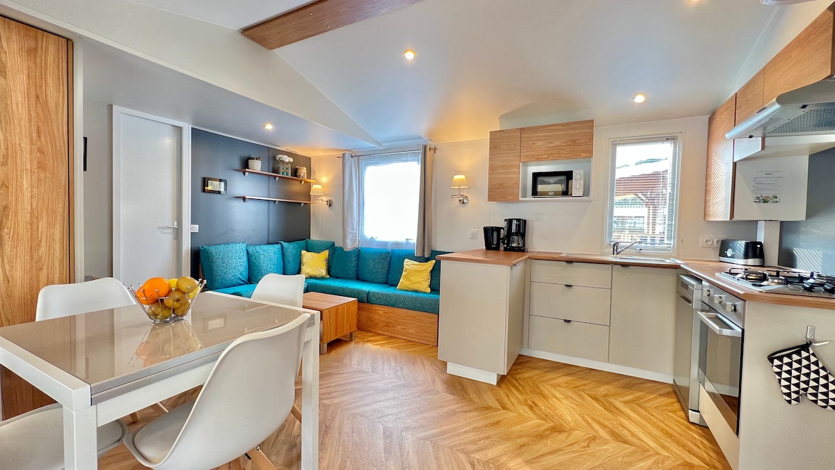 Ikhaya elisha eliselula elingu-35 m2 2023 endaweni yokukhempa yezinkanyezi ezingu-4. Ukubukeka kolwandle okubabazekayo, ebhishi ngo-100 m. Indawo yokuhlala enakho konke ukunethezeka. Izinto zombhede namathawula ongakhetha kukho. Umshini wekhofi we-Tassimo. Indawo yokubhukuda efudunyeziwe ifinyeleleka mahhala nendawo yokubhukuda yezingane. Indawo yokudlela iyatholakala kusayithi. Indawo yokudlala yezingane kanye nemisebenzi etholakalayo. Isitolo sokudla esisendaweni. I-pergola entsha ifakwe ngo-2024 Amabhola e-Petanque