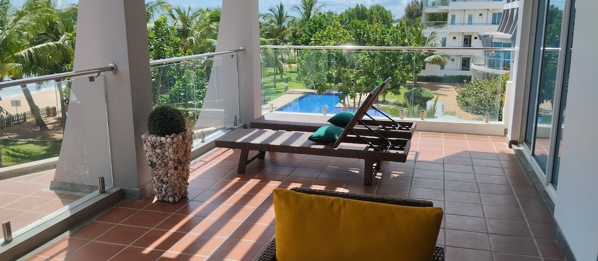 Book now for an unforgettable beachfront experience! - Beachfront Condo (120m² Single level 3BR, 2BA) - Full-sized kitchen to cook or order from Ocean Café - Balcony with 180° view of the Sea, Garden & Pool - Easy access to private beach -residents-only - Outdoor Swimming Pool - Mini-Gym - Gated compound with 24hr surveillance and parking - Located in a quiet coastal village 15km to downtown - Extremely safe neighborhood - Free fast Wi-Fi (FTTH) - Fun activities & things to do for everyone