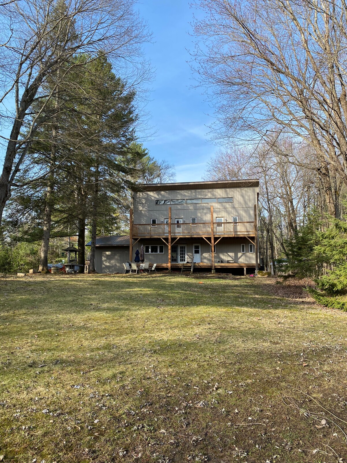 Leli kothiji eliphrayivethi kakhulu nelakhelwe ngesitayela sesimanje eliphambi kwechibi / eliphambi kwebhishi lase-Muskoka lisendaweni ekahle ekhoneni lechibi elihle, liqhele ngehora elilodwa nesigamu ukusuka e-GTA futhi ngamahora amabili ukusuka e-Toronto. Inezindawo ezinkulu zamahlathi amahle kakhulu e-Crown pine, inebhishi eliphrayivethi, kanye nedokhi entsha kanokusho esukela ogwini olunesihlabathi. Linendawo enkulu entsha yokuvuthisa inyama kanye ne-Weber BBQ enkulu yekhwalithi ephezulu. Usofa omusha wesikhumba. Bhukuda, doba, hamba ngesikebhe, hamba ngesikebhe se-kayak, thamela ilanga. Ingaphakathi lesimanje. I-Wi-Fi enejubane eliphezulu. Imizila. Umbungazi ovelele nesivakashi esiyintandokazi.