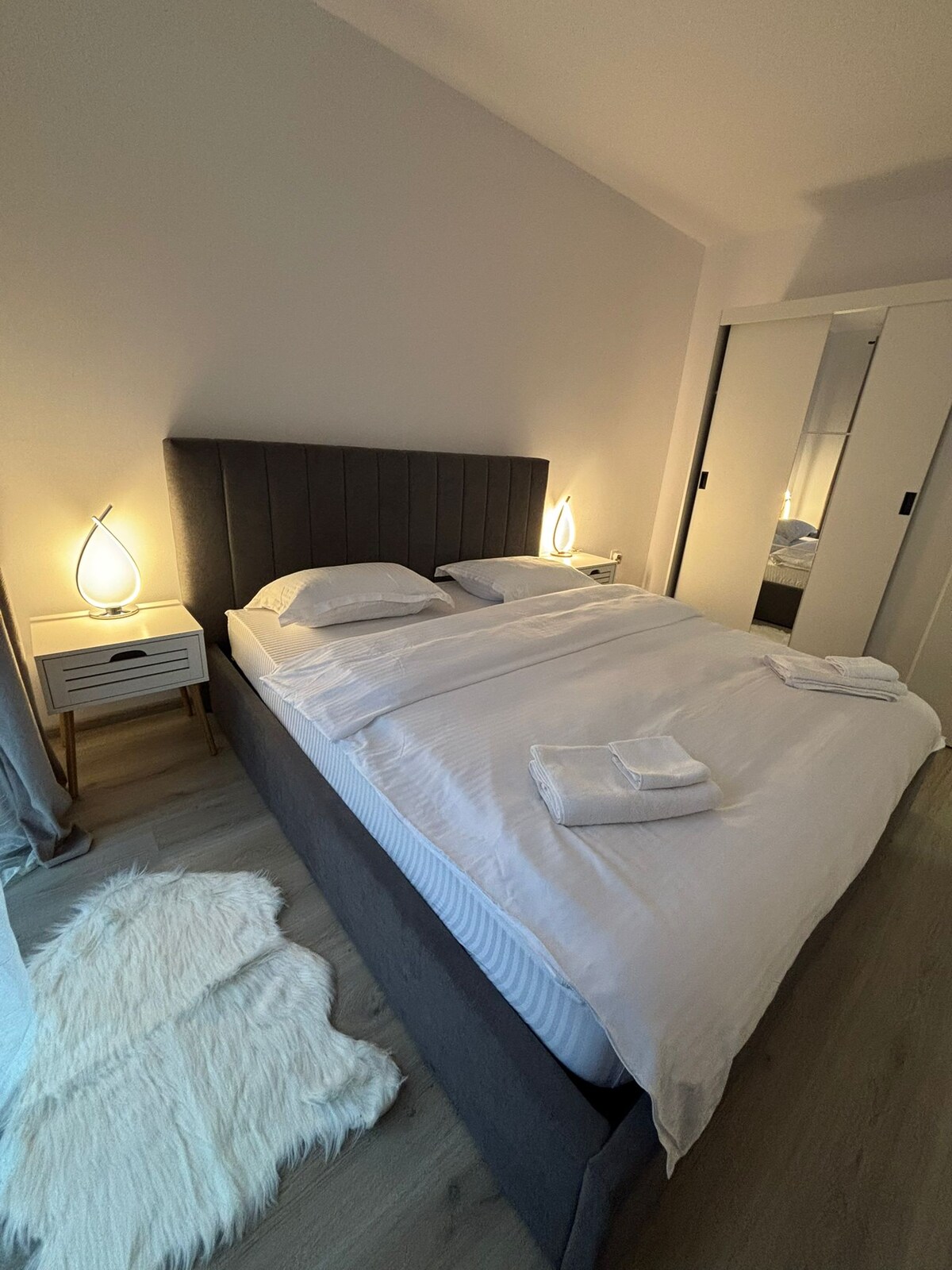Apartament cochet cu 2 camere pe Str. Egretei nr.6, Brașov — dormitor primitor cu pat dublu, living modern cu canapea extensibilă, bucătărie complet utilată, baie elegantă, hol spațios și terasă perfectă pentru relaxare. Situat într-o zonă liniștită, aproape de magazine, restaurante, parcuri și la doar câteva minute de centrul orașului. Ideal pentru un sejur confortabil!