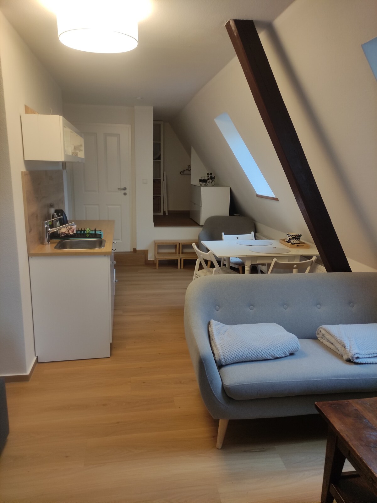Ukuzingenela/ukuphuma ngokwakho amahora angu-24, umbhede, ibhayisikili nokunye, indawo yokuhlala encane engamamitha-skwele angu-10, isitezi soku-1, indawo eyodwa, indawo yokungena ehlukile, imibhede engu-1 noma engu-2, indlu yangasese encane eyimfihlo (ishawa, usinki + indlu yangasese) ehlukaniswe egumbini, Ikhishi elincane elinefriji, uhhavini omncane + i-microwave, ideski elinesihlalo, isihlalo sokufunda, itafula elinezihlalo ezimbili, amashalofu, indawo yokulengisa izingubo, I-TV + i-Amazon Alexa, ilineni yombhede + amathawula, amabhayisikili mahhala, 350 m - ichibi, indawo yokubhaka, 550 m - isuphamakethe. 3 km edolobheni, 400 m - umgwaqo omkhulu, 15 m + 300 m isitobhu sebhasi, idolobha + inyuvesi: 12 min
