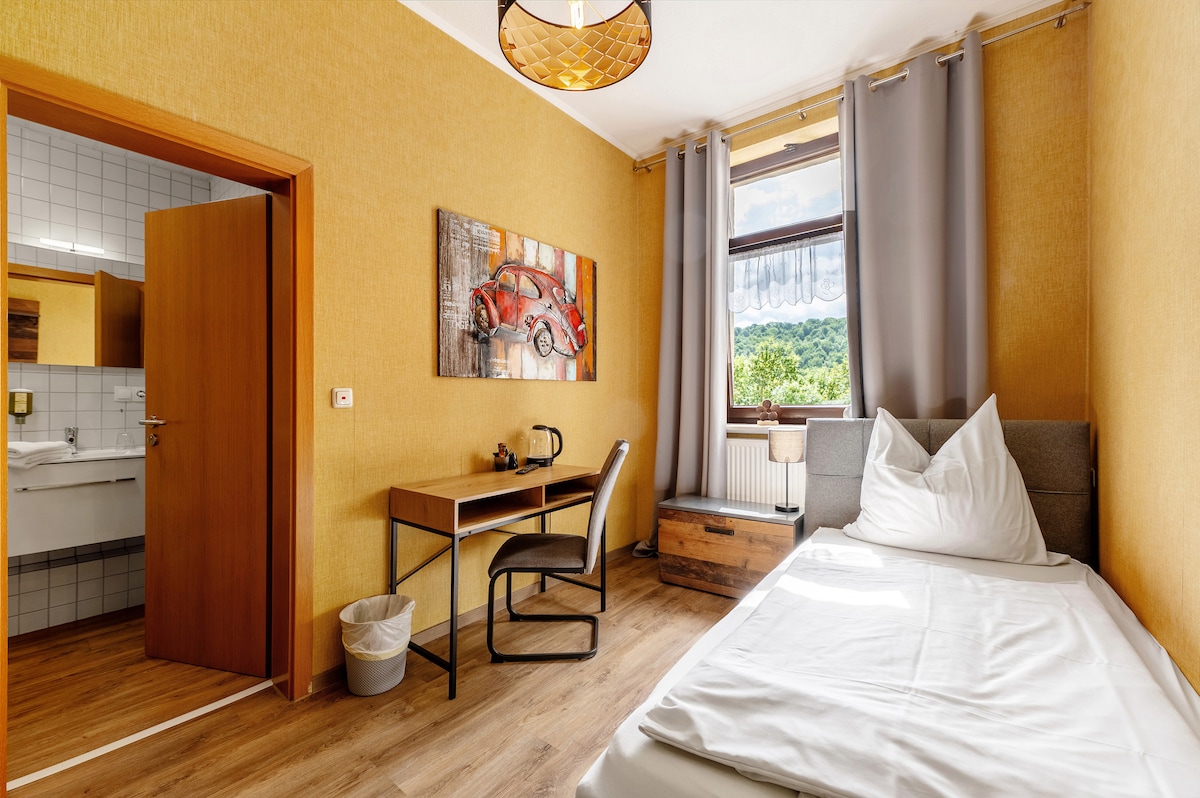 Double room Himmeltal with double bed (180x200). All rooms have their own bathroom, are non-smoking, pets are not allowed, heating/central heating, WiFi internet, no TV. Smoke detectors and carbon monoxide detectors are available. On request, you can book breakfast with us in advance of your stay. Smoking is prohibited throughout the house. Two bakeries and other shopping facilities (farm shop, pharmacy, two discount stores) are within a few minutes' walking distance.