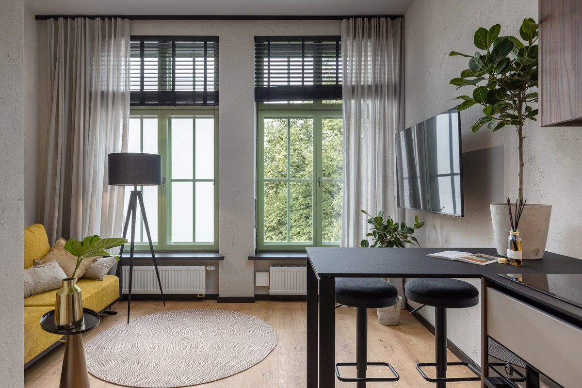 Cleaning once per week included in long stay booking over 28 days! Uniquely designed loft in the prestigious “Bibliotēkas nams” — a stunning Art Nouveau landmark in the very heart of Riga. This spacious 45 m² apartment on the 5th floor features a cozy balcony overlooking a peaceful courtyard. Just steps from Riga’s Old Town, cafés, and boutiques, yet exceptionally quiet — a perfect retreat for both work and relaxation.
